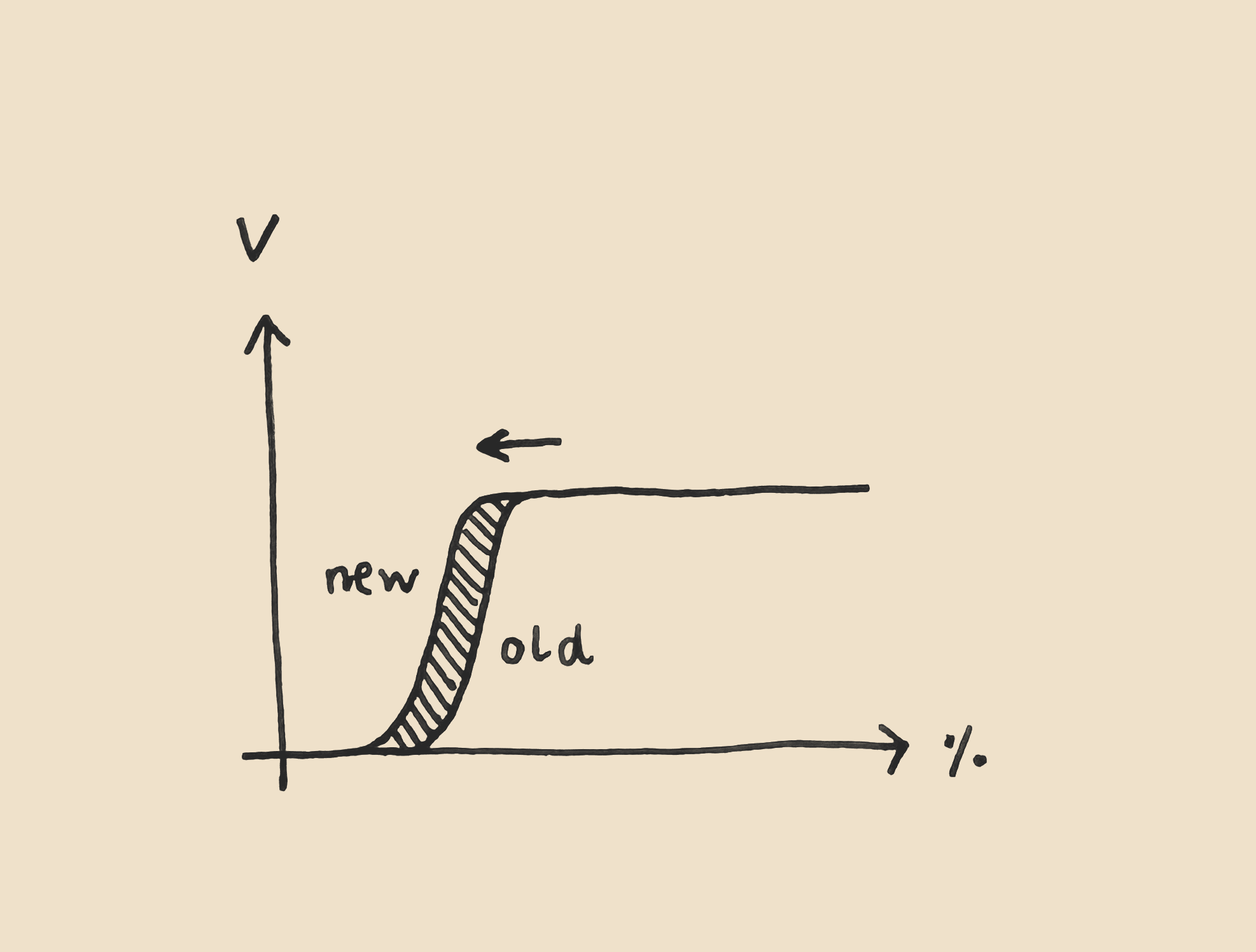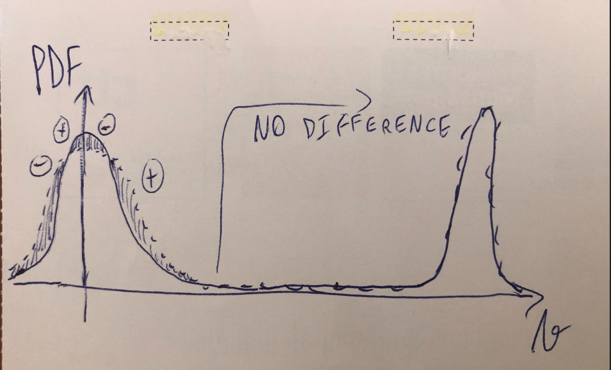 Secondly, and this is what I wanted to discuss here, calculations like the above crucially suppose the reduction in nearterm risk of human extinction is the same as the relative increase in the expected value of the future. For this to hold, reducing such risk has to increase the chance that the future has an astronomical value, which is what drives its expected value. Nevertheless, it only obviously makes worlds with close to 0 value less likely. It does not have to make ones with astronomical value significantly more likely. A priori, I would say the probability mass is moved to nearby worlds which are just slightly better than the ones where humans go extinct soon. Below is my rough sketch of the probability density functions (PDFs) of the value of the future in terms of human lives, before and after an intervention reducing the nearterm risk of human extinction[1].