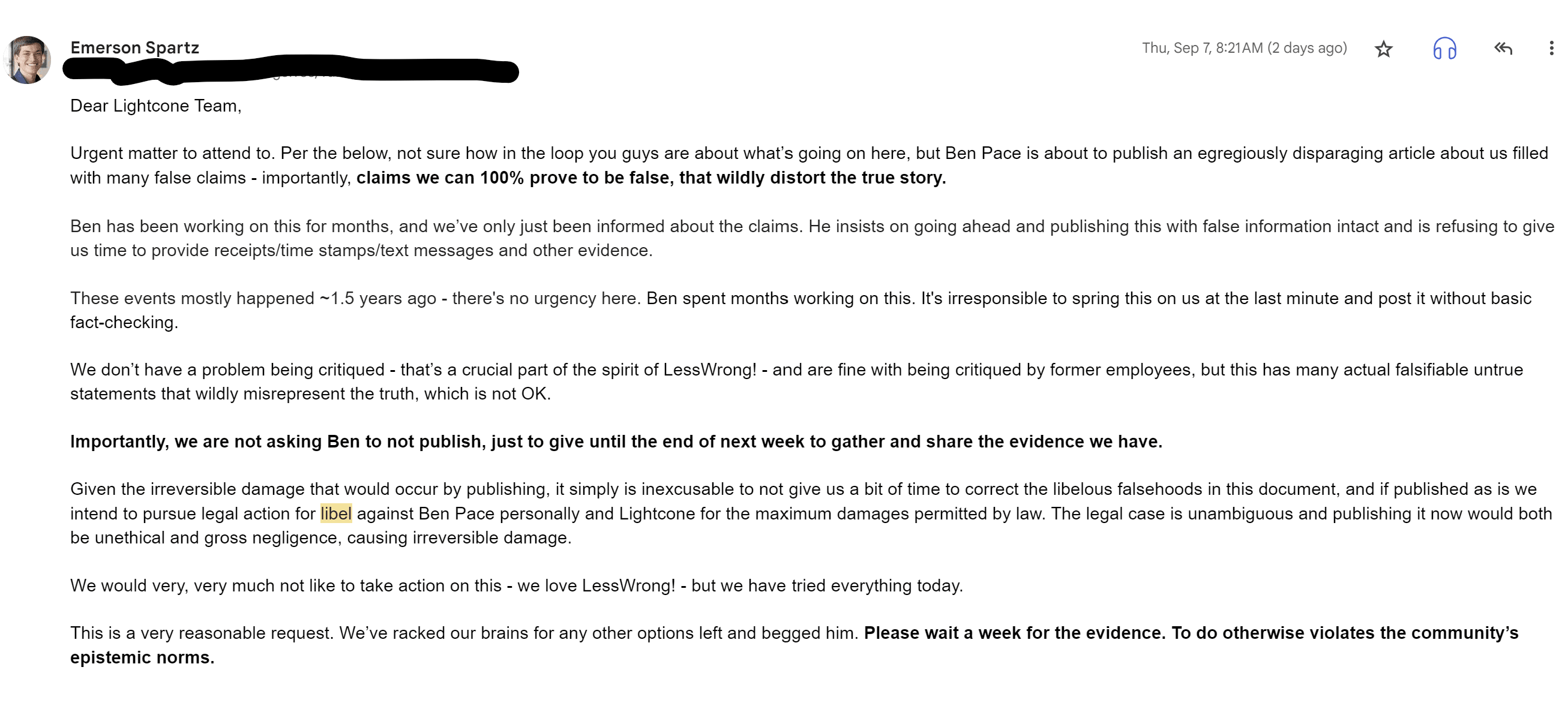 Separate from that, I think it’s good for other people to know what they’re getting into, so I think sharing this info is good because it is relevant for many people who have any likelihood of working with Nonlinear. And most importantly to me, I especially want to do it because it seems to me that Nonlinear has tried to prevent this negative information from being shared, so I am erring strongly on the side of sharing things.