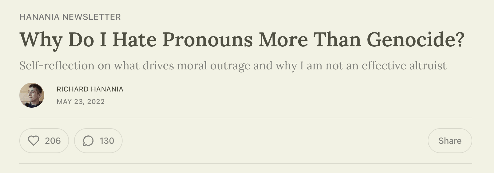 Someone below pointed out that you misrepresented his pronouns/genocide essay, which I saw as an unusually self-reflective look at why he and others have, as he puts it, "deranged" priorities in getting the most animated not about objectively the most important ideas but about emotionally salient topics close to home. The point of the essay is not "they/them pronouns are worse than genocide," but "it is in one sense deranged, but human and important to understand, that people get so much more emotionally invested in issues like they/them pronouns than about genocide."