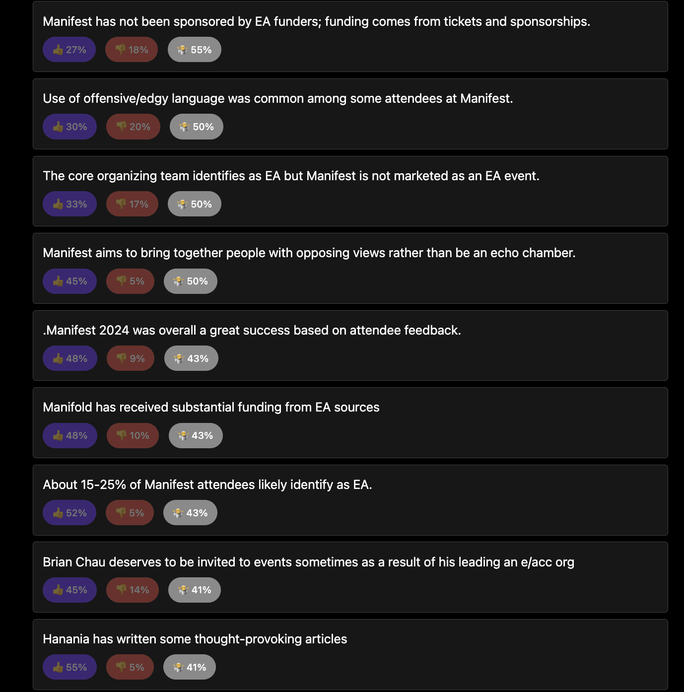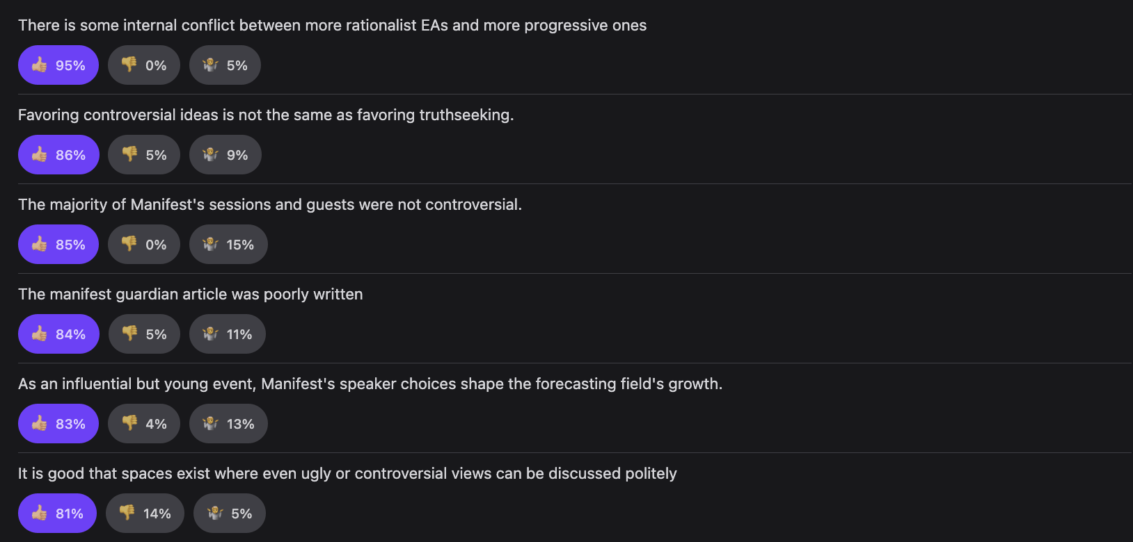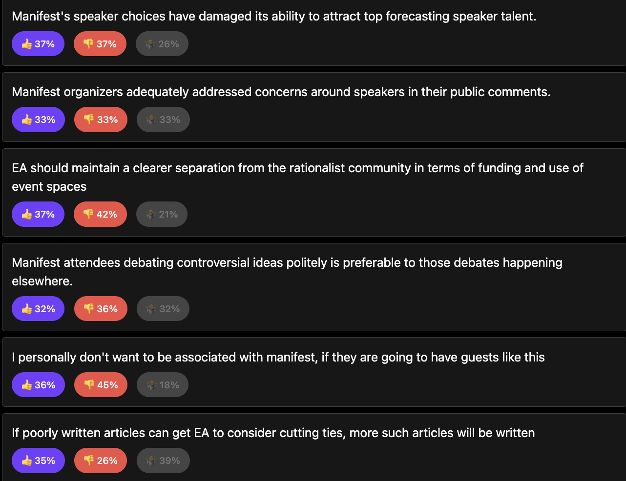 Additionally, I would be interested in some kind of prediction markets to resolve some of the empirical questions. E.g. What percentage of EAs would say 'agree' or 'strongly agree' to the statement 'person X should not have been an invited speaker to manifest'. Note I am new to prediction markets so am not comfortable setting up a question like this which does not have an objective resolution.
