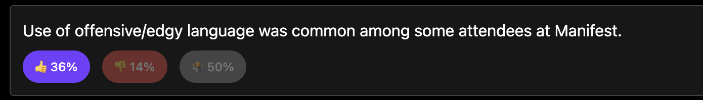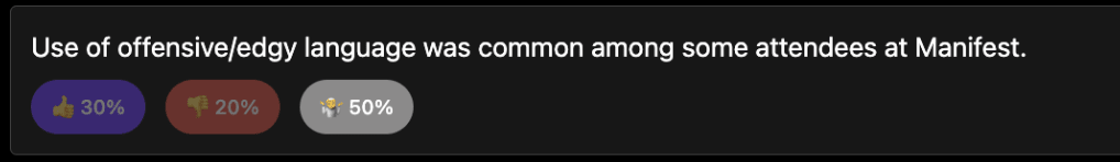 Nothing in the post seems to refute that the reported exchanges occurred among attendees, just that the organizers didn’t go out of their way to invite controversial/racist speakers or incite these exchanges. In other words, I think everything in the post is compatible with there having been “so many” racists at Manifest, but the quotation marks in the title seem to imply otherwise.