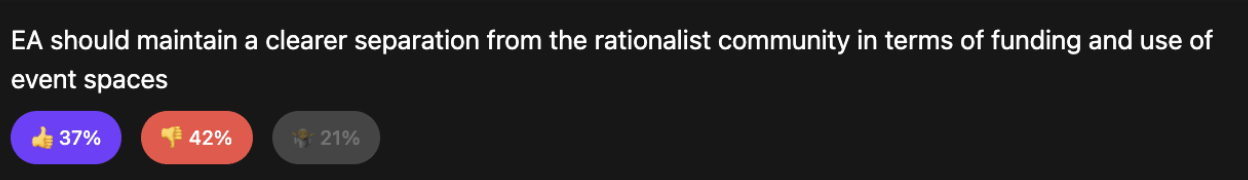 - How much should the EA community influence the norms of and/or associate with the rationality/forecasting community