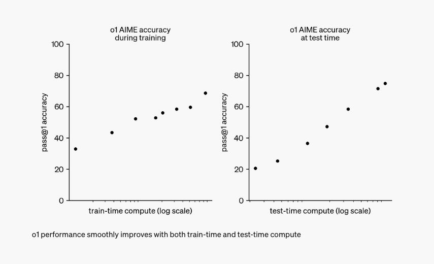 o1 allowing more efficient scaling with inference (test-time) compute. According to OpenAI, “the performance of o1 consistently improves with more reinforcement learning (train-time compute) and with more time spent thinking (test-time compute),” both on log scales.