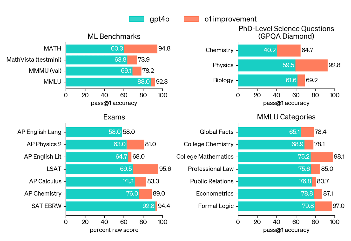 - In sciences, o1 outperformed human experts with PhDs on GPQA diamond, a difficult benchmark for expertise in chemistry, physics and biology.