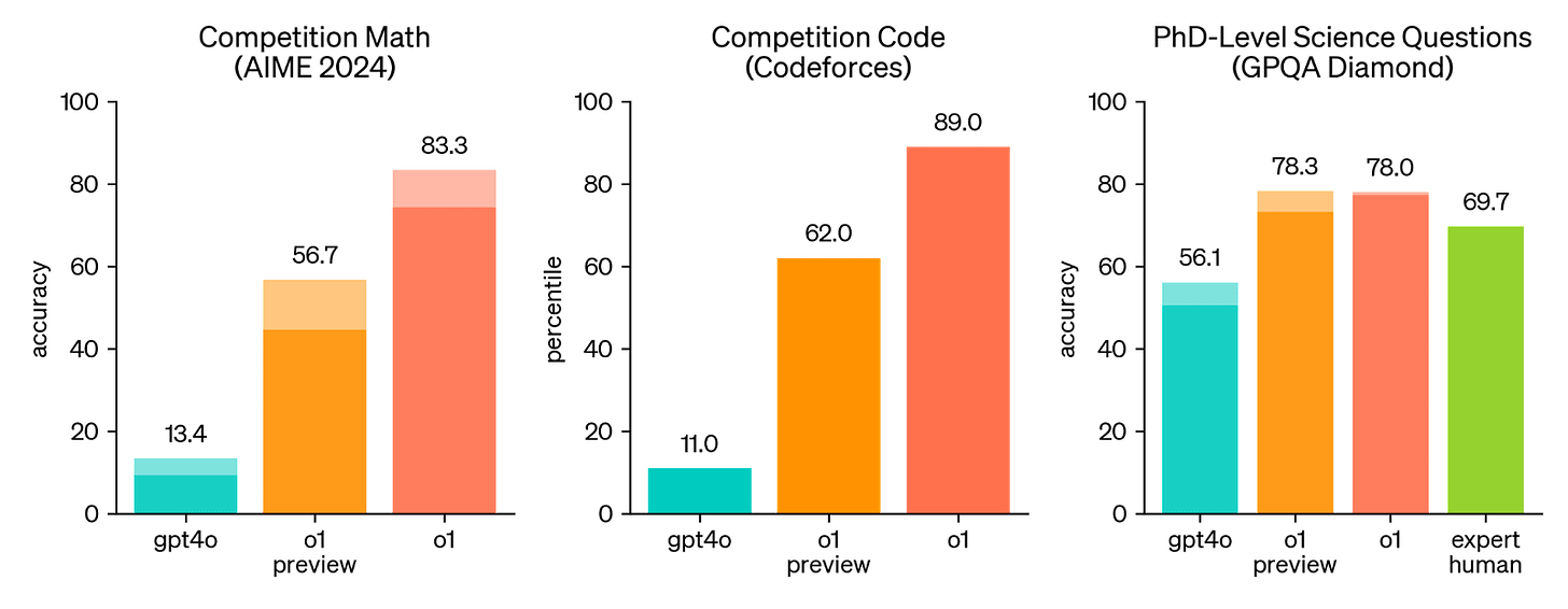 o1 models outperform previous models—and sometimes rival human experts—in solving hard problems in coding, mathematics, and sciences.