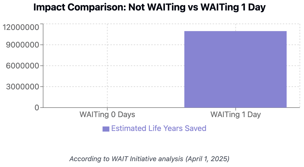 To efficiently estimate existential risk from AI, consider the only two possibilities: AI extinction or survival. We thus derive an existential risk parameter of 50%. Multiplying by ~8 billion human beings on earth * 1/365 (per day saved) we estimate ~10,958,904 years of human life could be saved per day of WAITing. This figure is further evidence: