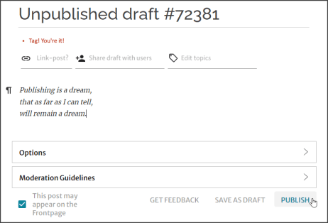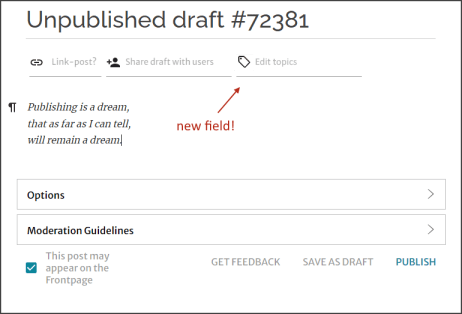 Right now, you can't tag a post while you're writing it. You have to "save as draft" and then add the tags to the draft, or add the tags after you publish it. This is needlessly annoying. I suggest making it like this: