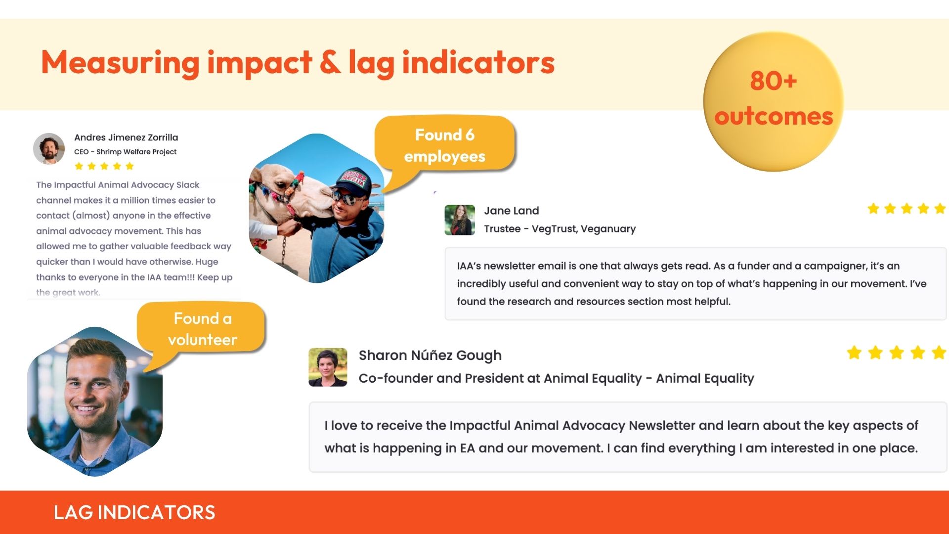 - Feedback from orgs like Animal Advocacy Africa, Ethical Seafood Research and others