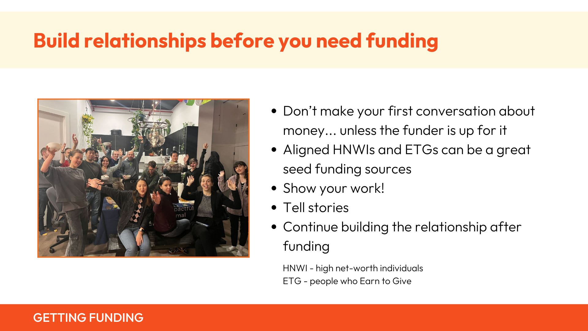 Good question! It's important to avoid putting yourself in a place where you are desperate for funding, because then you can search for the right funder slowly and focus on impact instead. For example, I advised in this talk to avoid quitting your job or main source of income until you have more certainty about funding. This allows you time to get to know the funders informally without having to make asks immediately. Many people are surprised to learn that funding for such projects can take a year or longer to secure. I think it's quite a normal timeline, as trust and reputation take a long time to build.