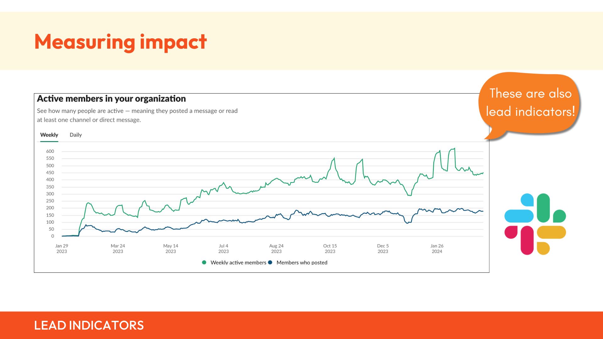 - Lead indicators – Early signs of traction (e.g. number of Slack members, engagement metrics such as newsletter click-through rate or Slack weekly active users)
