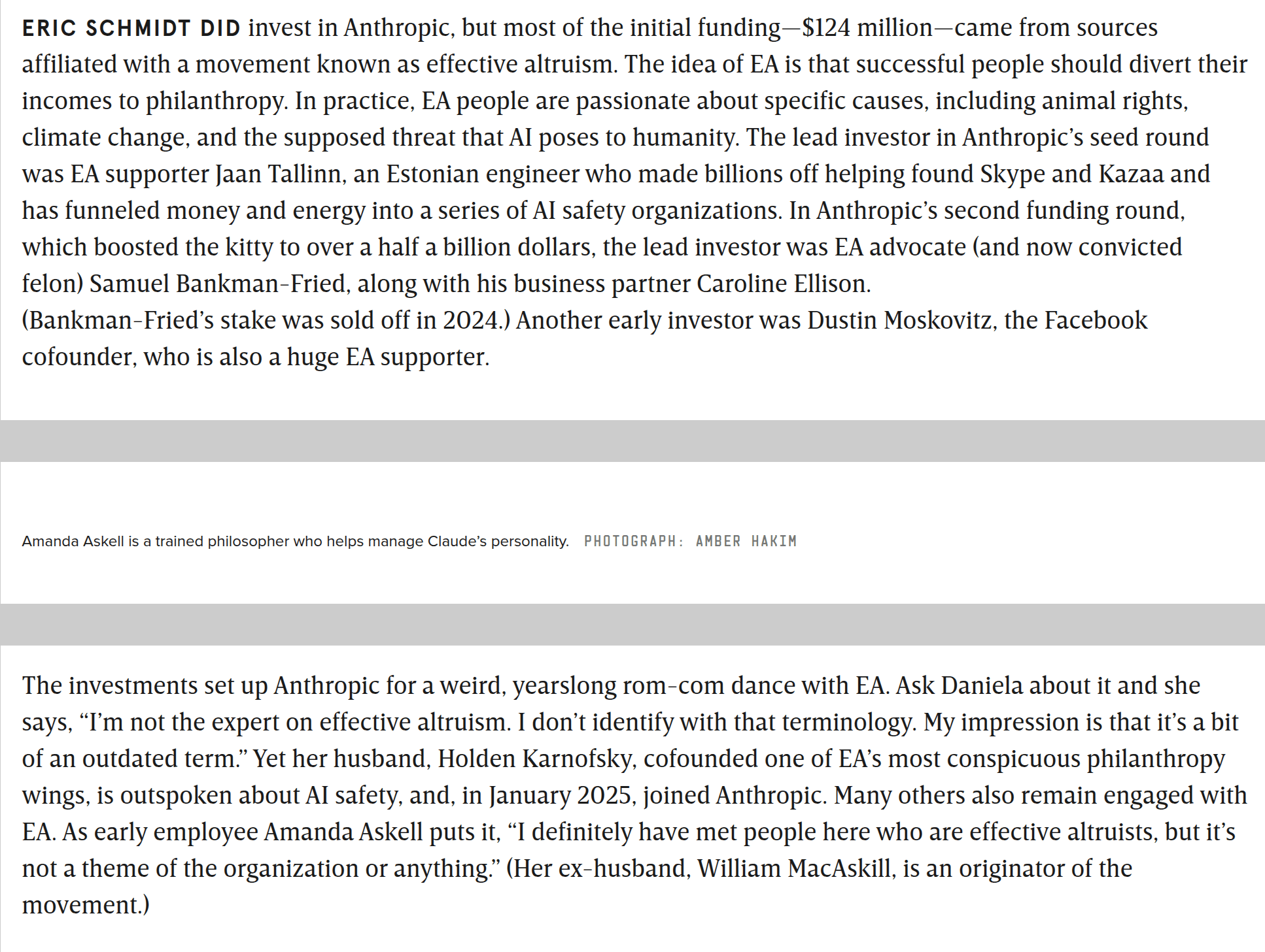 Ask Daniela about it and she says, "I'm not the expert on effective altruism. I don't identify with that terminology. My impression is that it's a bit of an outdated term". Yet her husband, Holden Karnofsky, cofounded one of EA's most conspicuous philanthropy wings, is outspoken about AI safety, and, in January 2025, joined Anthropic. Many others also remain engaged with EA. As early employee Amanda Askell puts it, "I definitely have met people here who are effective altruists, but it's not a theme of the organization or anything". (Her ex-husband, William MacAskill, is an originator of the movement.)