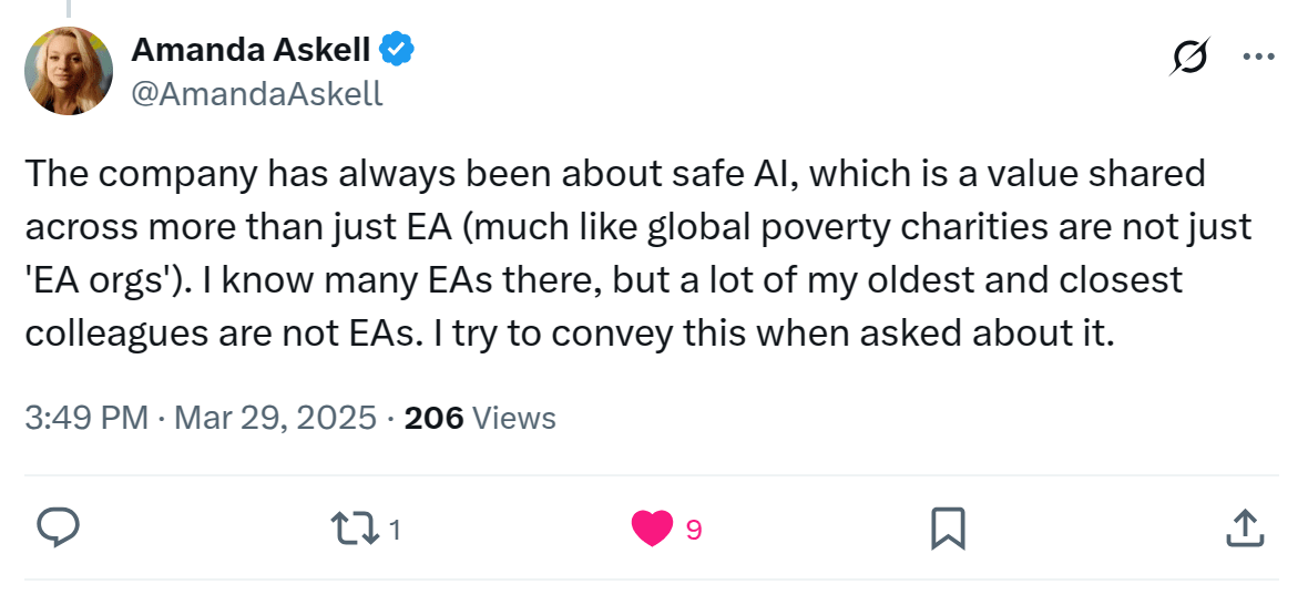 Not that I'm accusing her of dishonesty here or anything: she didn't say that she wasn't EA or that she had never been EA, just that Anthropic wasn't an EA org. Indeed, given that I just checked and she still mentions being a GWWC member prominently on her website, and she works on AI alignment and wrote a thesis on a weird, longtermism-coded topic, I am somewhat skeptical that she is trying to personally distance from EA: https://askell.io/