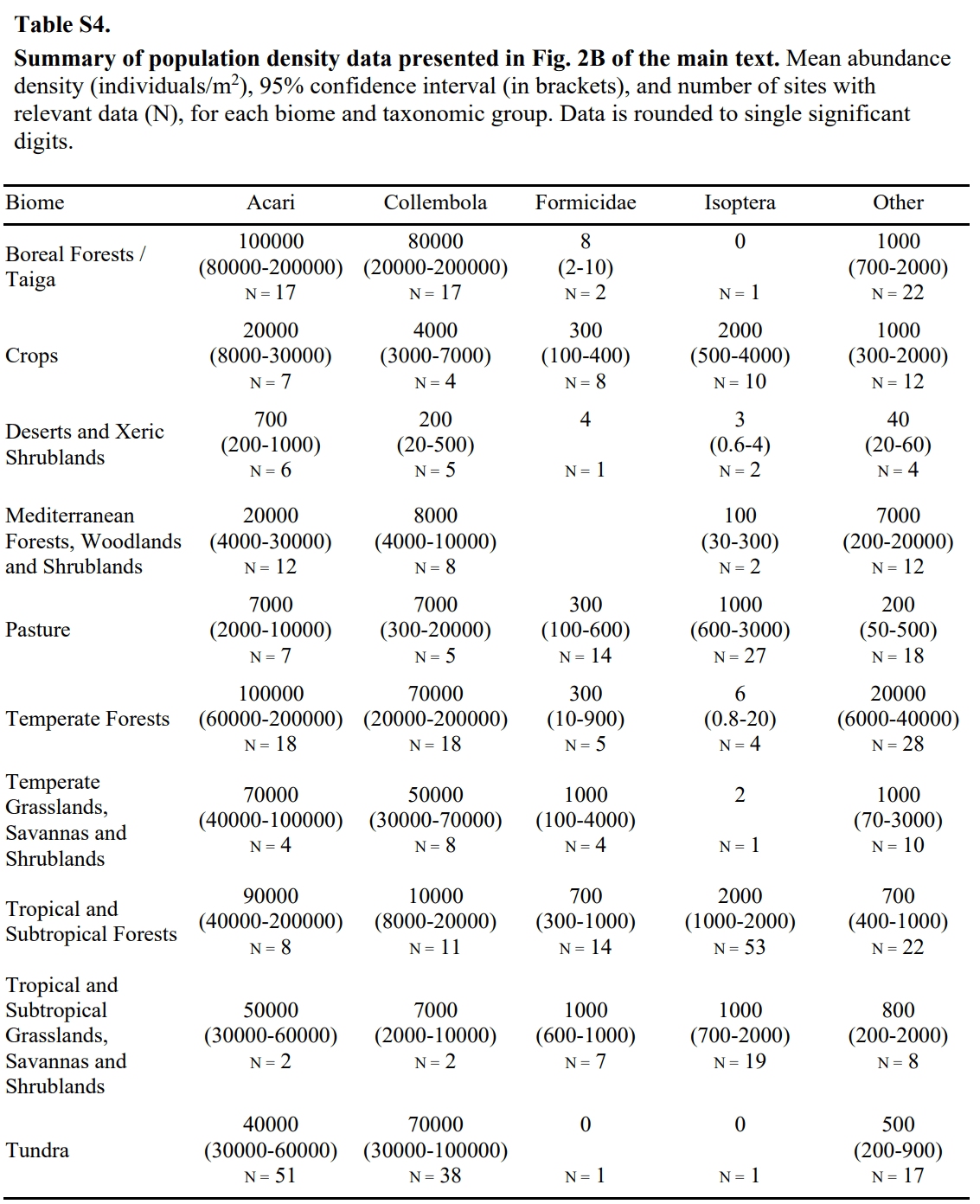 Table S4 of Rosenberg et al. (2023) has data on the density of soil mites (acari), springtails (collembola), ants (formicidae), termites (isoptera), and other arthropods. Here is a sheet with the numbers.