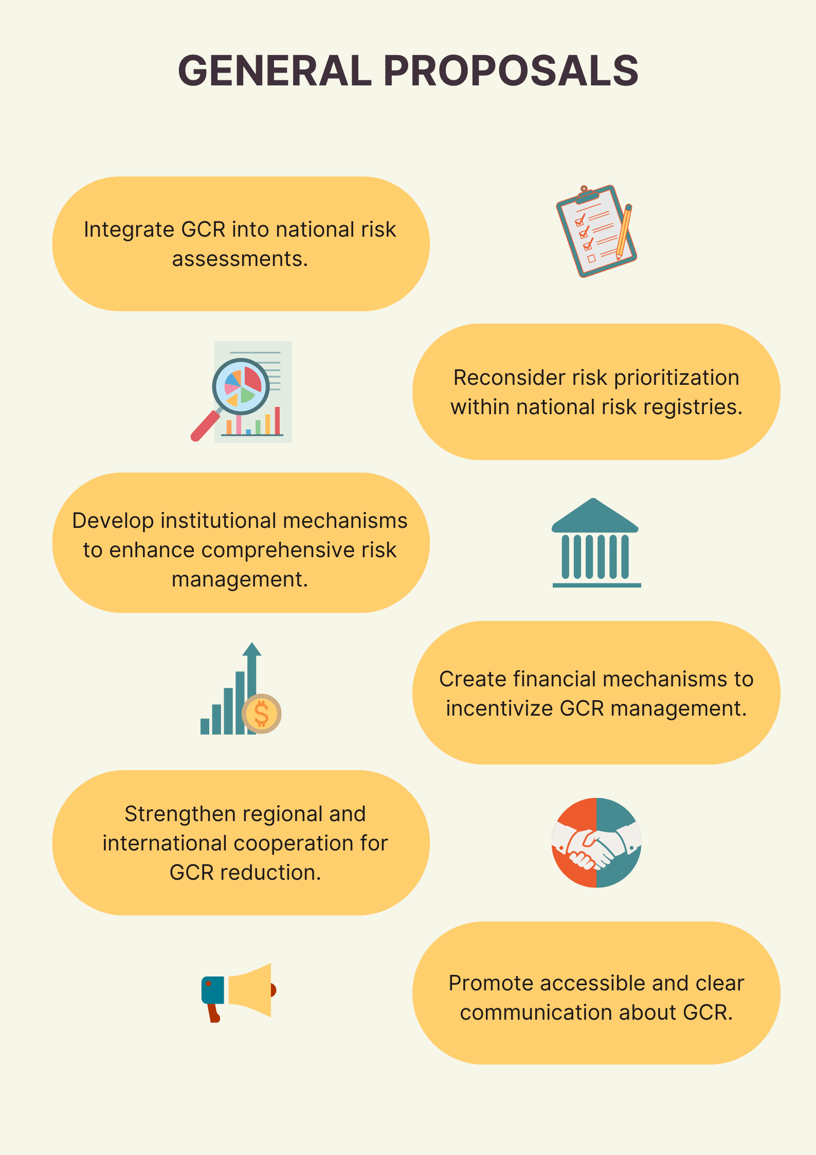 These risks represent global challenges that require international cooperation and adequate management. Various stakeholders have shared their growing concern around GCRs. Among them is the Secretary-General of the United Nations, the Organization for Economic Cooperation and Development (OECD), the United Nations Office for Disaster Risk Reduction (UNDRR) (Appendix 1 - UNDRR interview), the World Economic Forum (WEF), as well as civil society organizations and research centers. To prevent them, countries like the United States, the United Kingdom, and Norway have articulated their own local efforts, such as legislation and national plans.