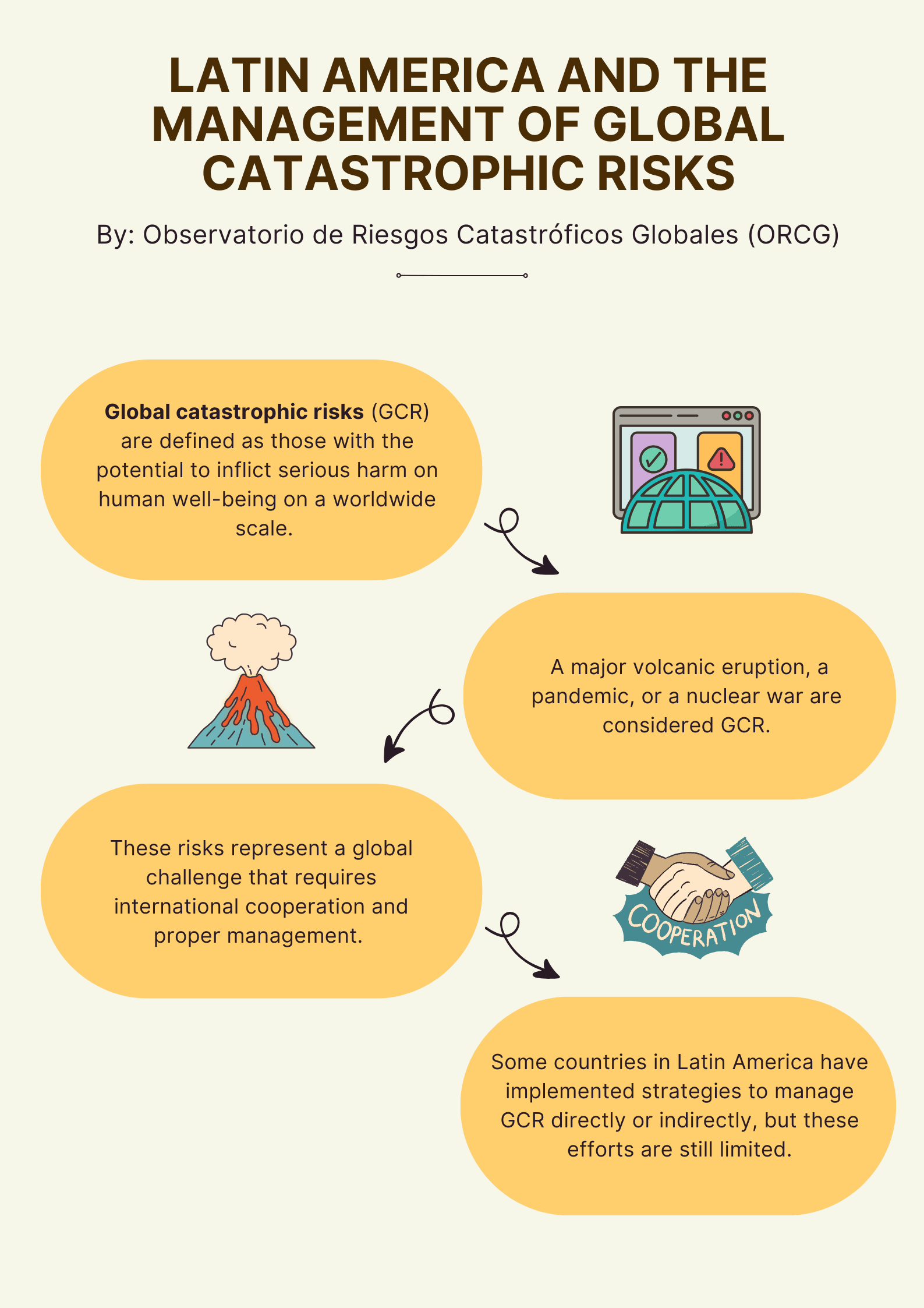 For its part, Latin America has had to strengthen its institutions and coordination mechanisms at the national and regional levels due to its high exposure to these risks. Although a minority of Latin American countries have implemented some strategies to prevent, mitigate, or respond directly or indirectly to GCRs, efforts are limited. Despite this, we highlight that, in the past, the region has demonstrated its capacity to contribute to initiatives related to nuclear disarmament and the elimination of biological weapons.