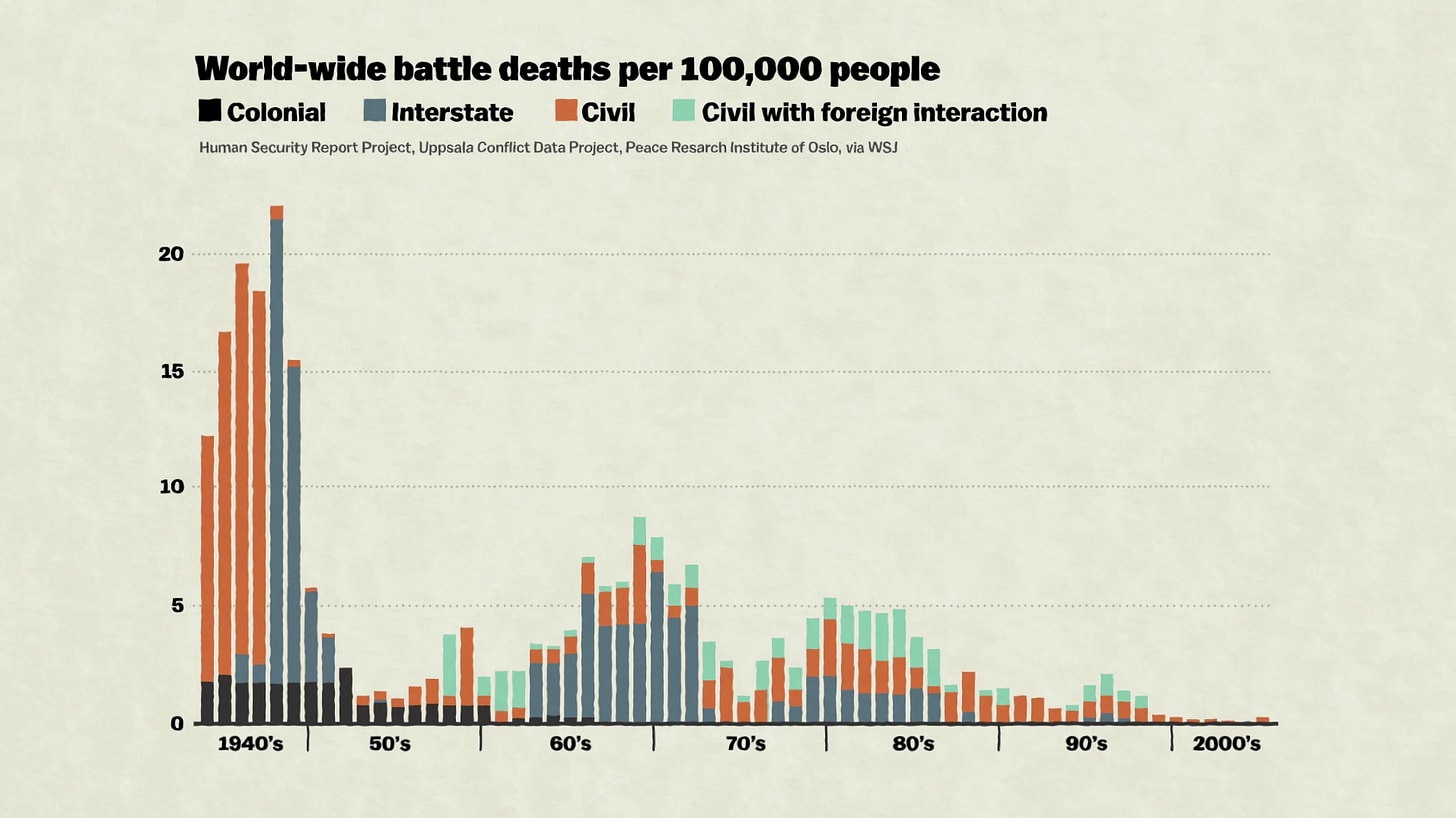 Steven Pinker's "Better Angels of Our Nature" documents a multi-century decline in violence. Deaths from interstate war fell from about 90 per 100,000 people per year in early modern Europe to 15 per 100,000 people during World War II to 0.2-0.3 per 100,000 in recent decades. The Uppsala Conflict Data Program confirms interstate conflicts remain rare through 2023, with only 2-3 active interstate wars most years compared to 10-15 during the early Cold War.
