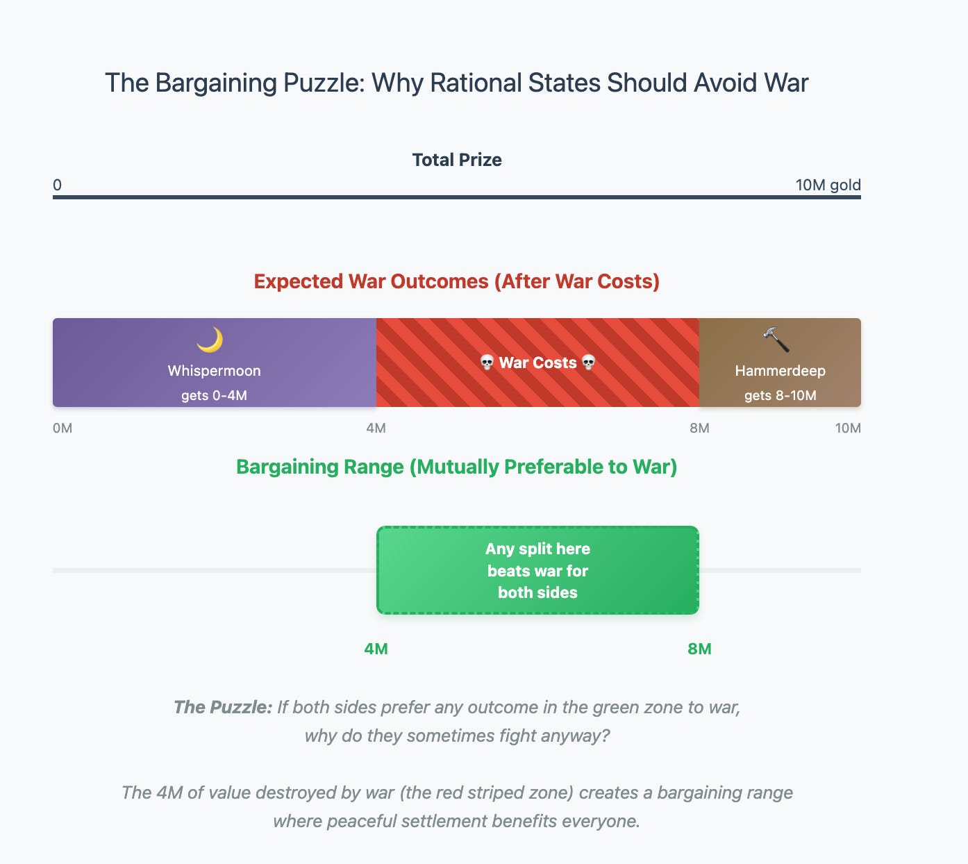 Suppose the Elven Republic of Whispermoon and the Dwarven Kingdom of Hammerdeep quarrel over a divisible prize: territory, mining rights, spheres of influence. Each knows its own military strength and the likely costs of fighting, but neither can be absolutely certain about the other’s resolve or capabilities. Before the first arrow is fired, both sides already understand an uncomfortable truth: War is extremely expensive in both blood and treasure. More formally, any war will destroy real resources that could have been bargained over instead. There is, in other words, a bargaining range—a set of negotiated terms that both sides would strictly prefer to the gamble of battle.