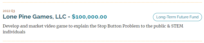 In July 2022, EA approved a $100,000 grant to Lone Pine Games, LLC, for developing and marketing a video game designed to explain the Stop Button Problem to the public and STEM professionals.