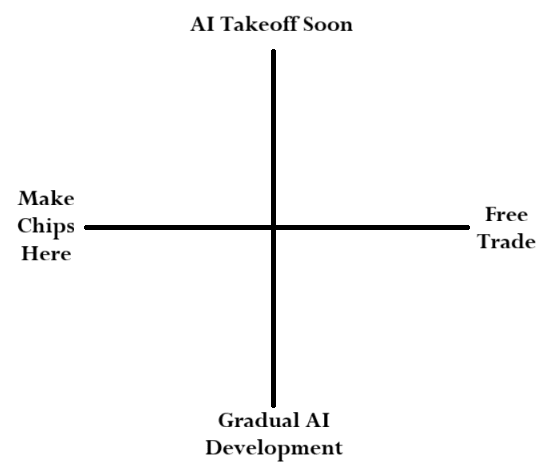 If AI takeoff is fast, the question of where the chips will be located is already determined - policies for building fabs and energy production matters over the next decade, not before 2028. So if AI takeoff happens soon, and (neglected third dimension,) if control of the chips actually matters because the AI takeoff doesn’t kill us all, then running the race and prioritizing industrial policy over free trade doesn’t make sense, it’s too late to matter.