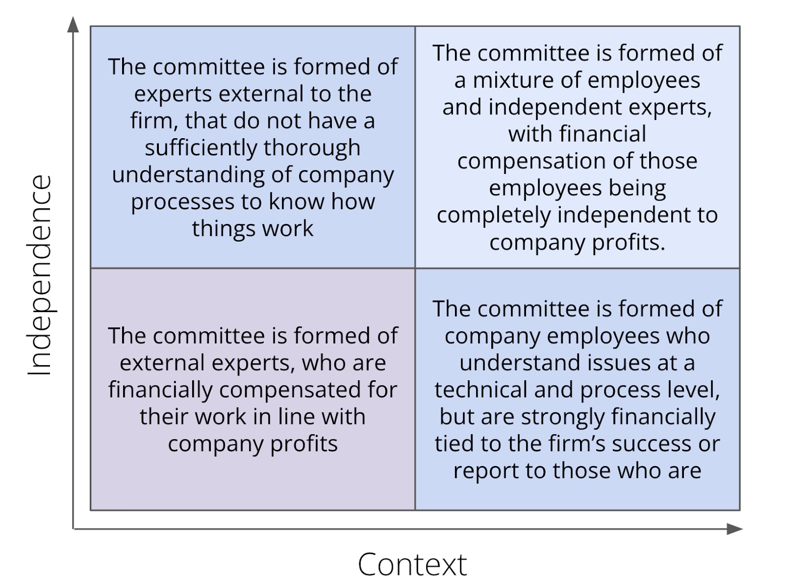 Providing effective challenge refers to the ability to diagnose relevant issues in the company and propose practical options to solve them. Doing so requires an in-depth understanding of the company’s processes and technology, and an ability to consider systems from intrinsic and extrinsic points of view. It also requires self-awareness about how personal motivations of the members may conflict with the stated objectives of the committee, combined with an active effort to adjust for those biases. These requirements can be considered along two axes of context and independence, as shown below.
