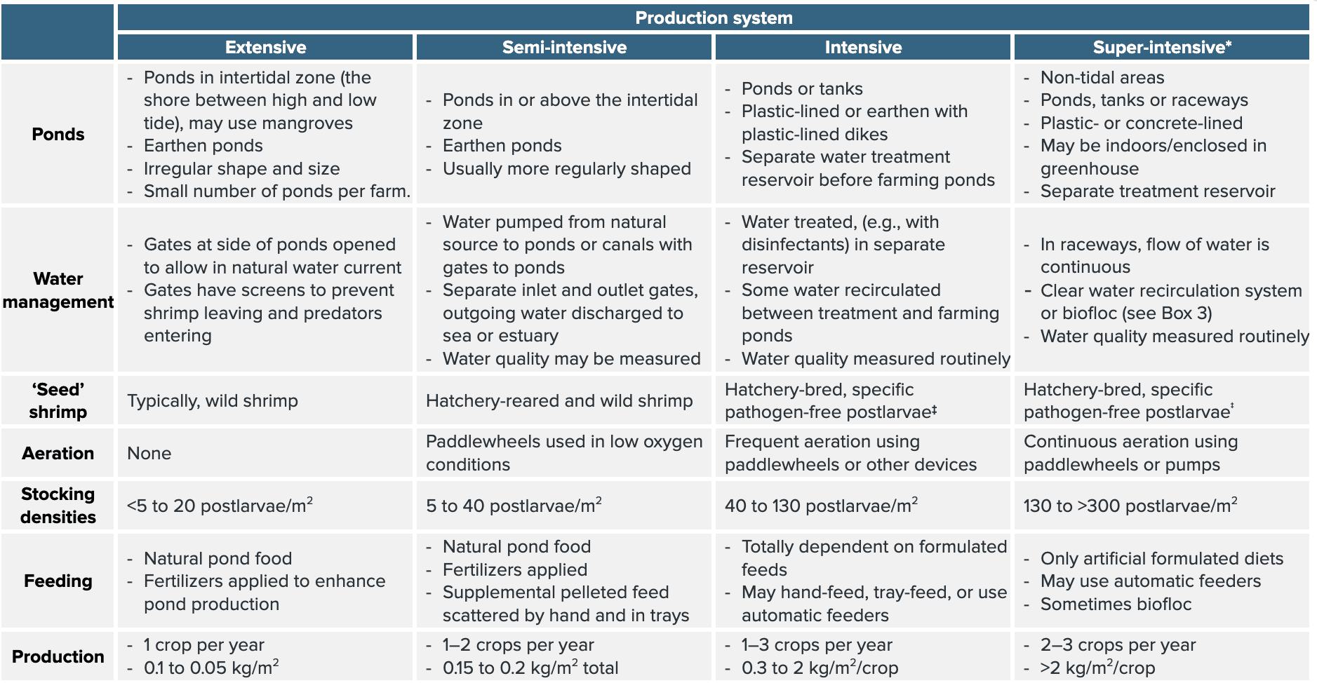 Table 1. Characteristics of extensive, semi-intensive, intensive, and super-intensive penaeid shrimp farms. Based on Oddsson (2020), HATCH (2019b), and Boyd & Jescovitch (2020, pp. 243â244).