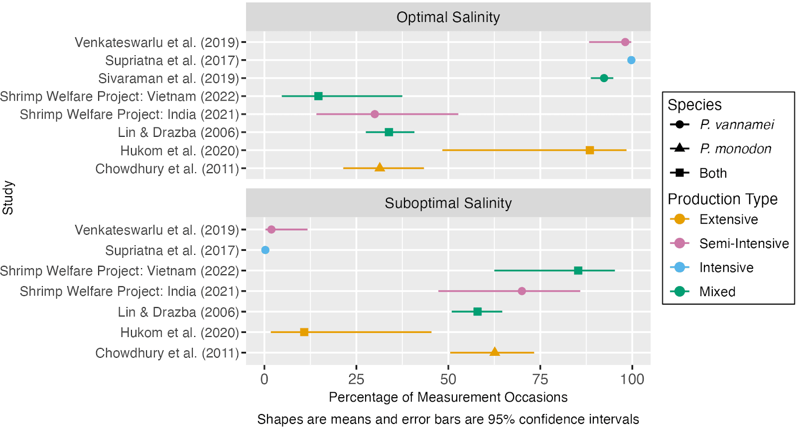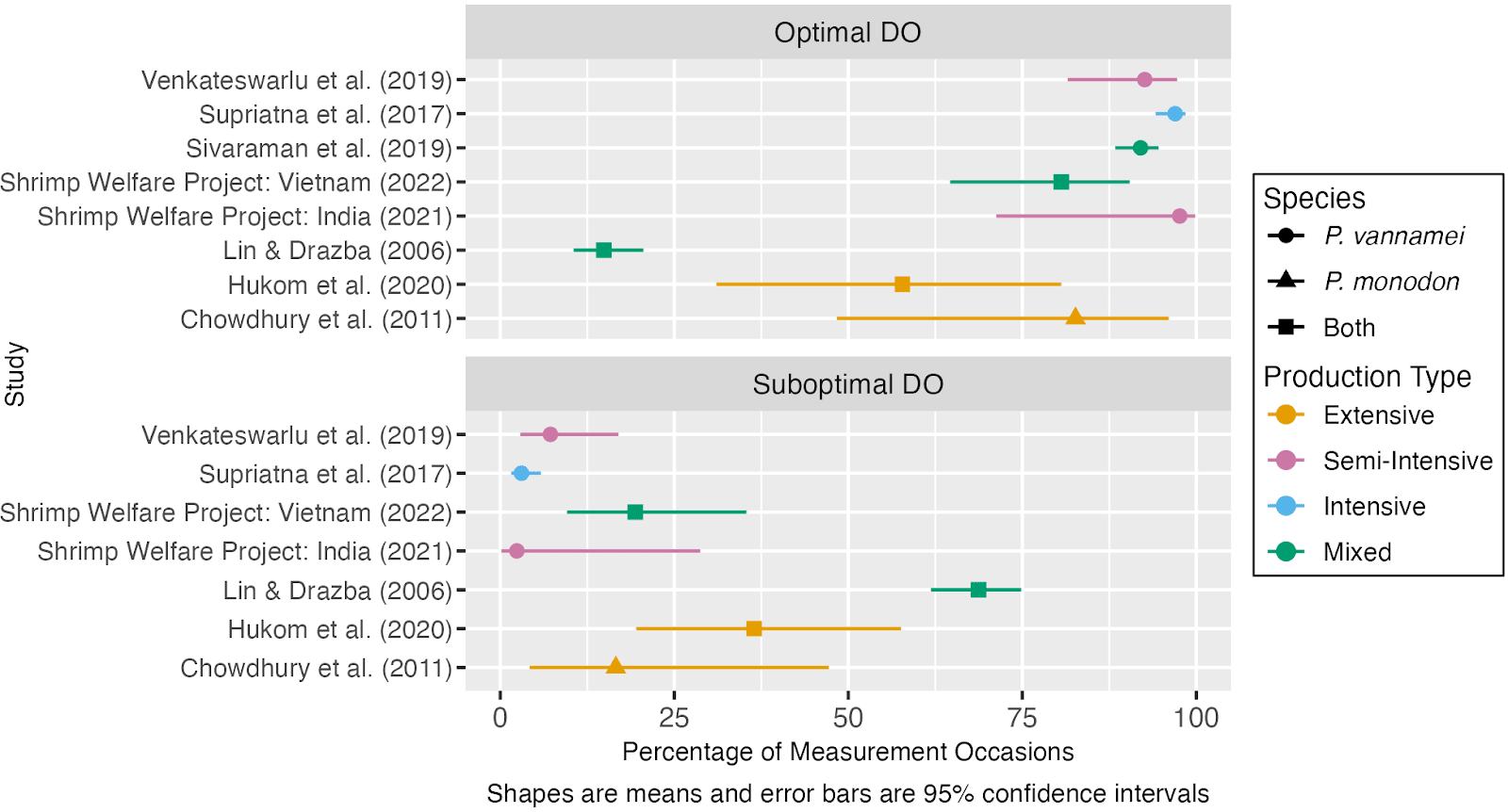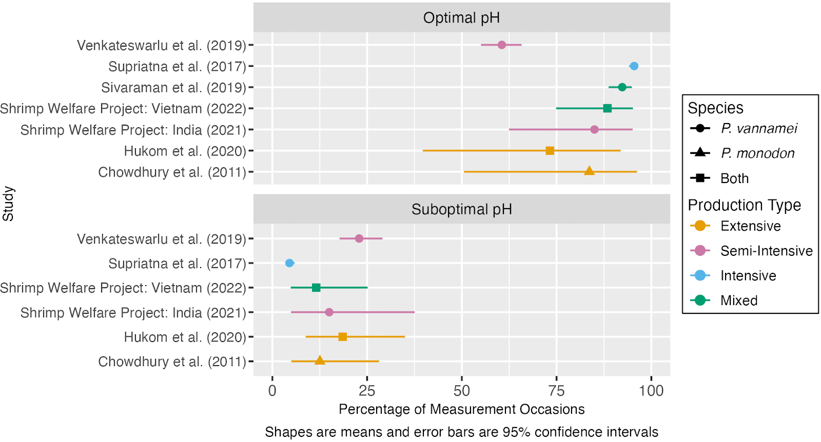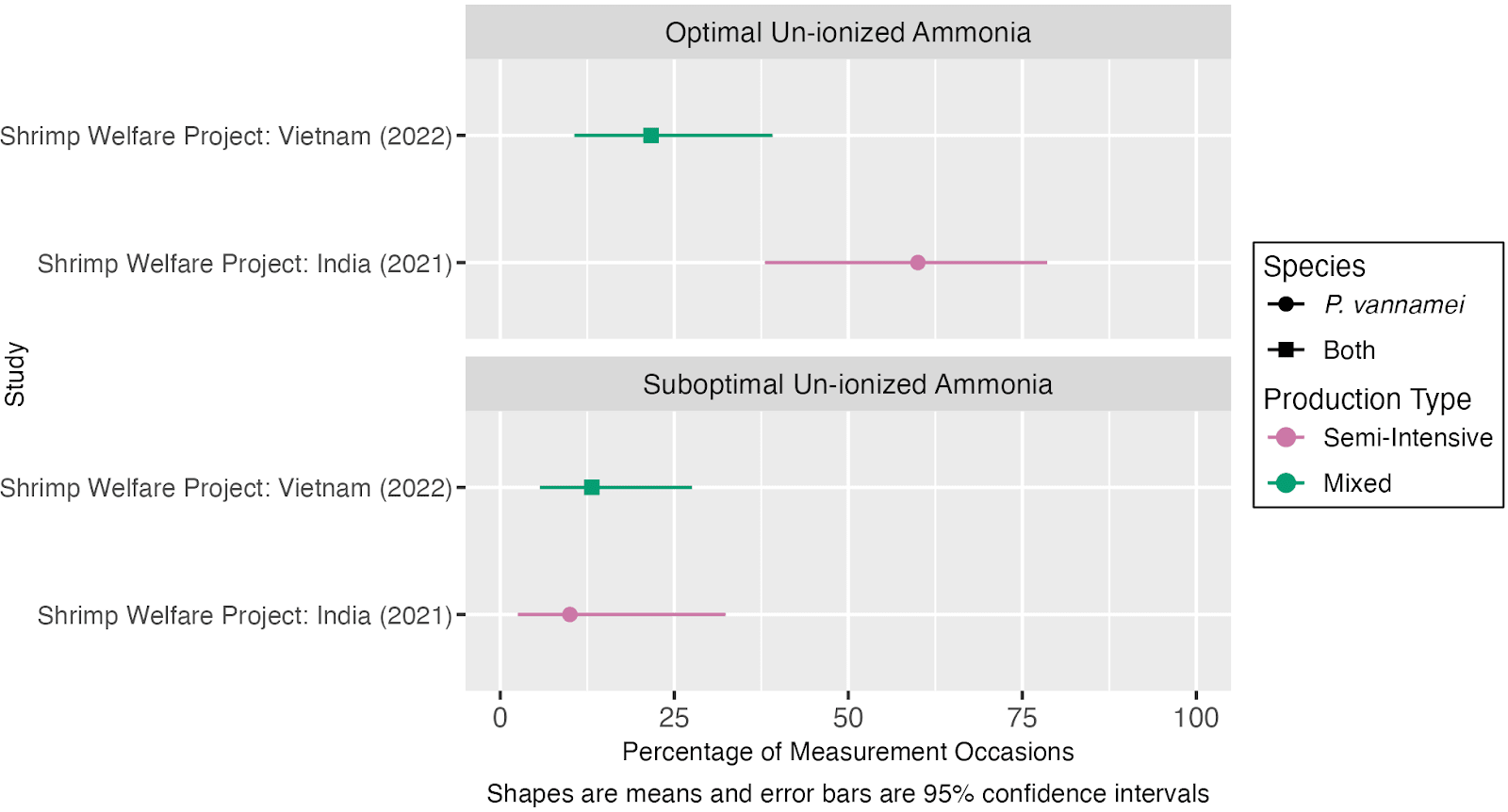 We extracted data from surveys to estimate the extent to which farms maintain water quality within the recommended ranges. For each study, we estimated the average percentage of the time that water quality is "optimal" (i.e., no negative welfare effects) and "suboptimal" (i.e., negative welfare effects that are either sublethal only or cause lethality at rates that are typical in natural conditions), from which we can also infer how often it is unacceptably low. The complete analysis, including a discussion of the limitations of available data, is available in our supplementary document, Water Quality in Shrimp Ongrowing Ponds; the results are summarized in figures in the subsections below.