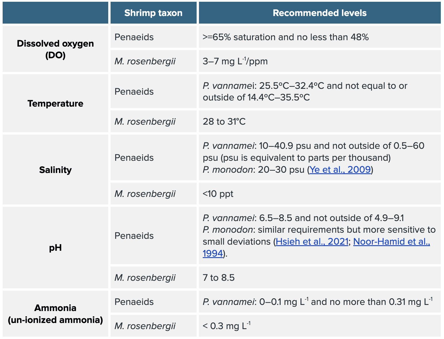 Table 3. Recommended levels of water quality parameters for penaeids and M. rosenbergii in ongrowing ponds. Recommendations for penaeids are from Pedrazzani et al. (2023, Table 11) unless otherwise stated, and those for M. rosenbergii are from New (2002, p. 19).