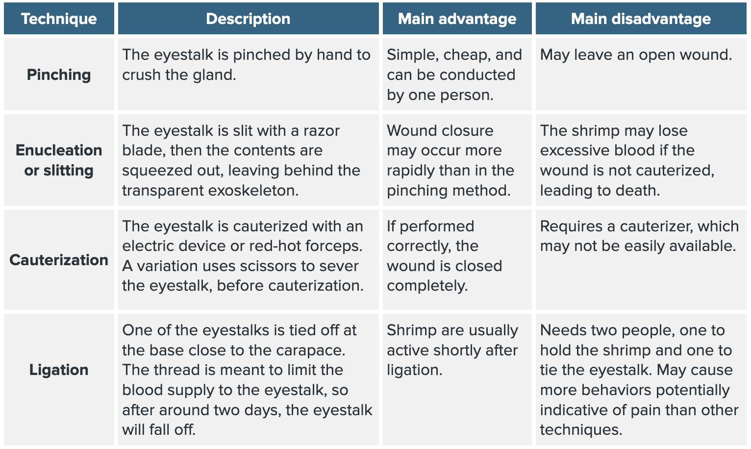 Table 5: Eyestalk ablation techniques. Based on Bray & Lawrence (1992, pp. 118â119), EGTOP (2014, pp. 15â16), and Primavera (1989, pp. 11â12).