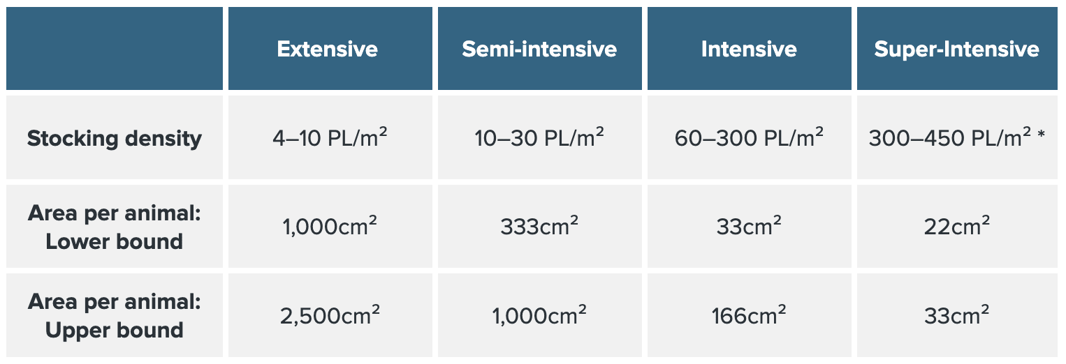 Ongrowing facilities are typically characterized as extensive, semi-intensive, intensive, or super-intensive, depending on their yield potential per unit area per time period. The FAO notes that these categories do not describe the actual diversity in operating practices implemented in different locations (Barg et al., 1999). That said, there are clusters of practices and conditions that roughly align with how intensively managed a farm is, which we list in Table 1 below. Note that any numerical estimate is relative to time and place, so our numerical ranges reflect our best understanding of contemporary differences in countries with the greatest amount of shrimp production.