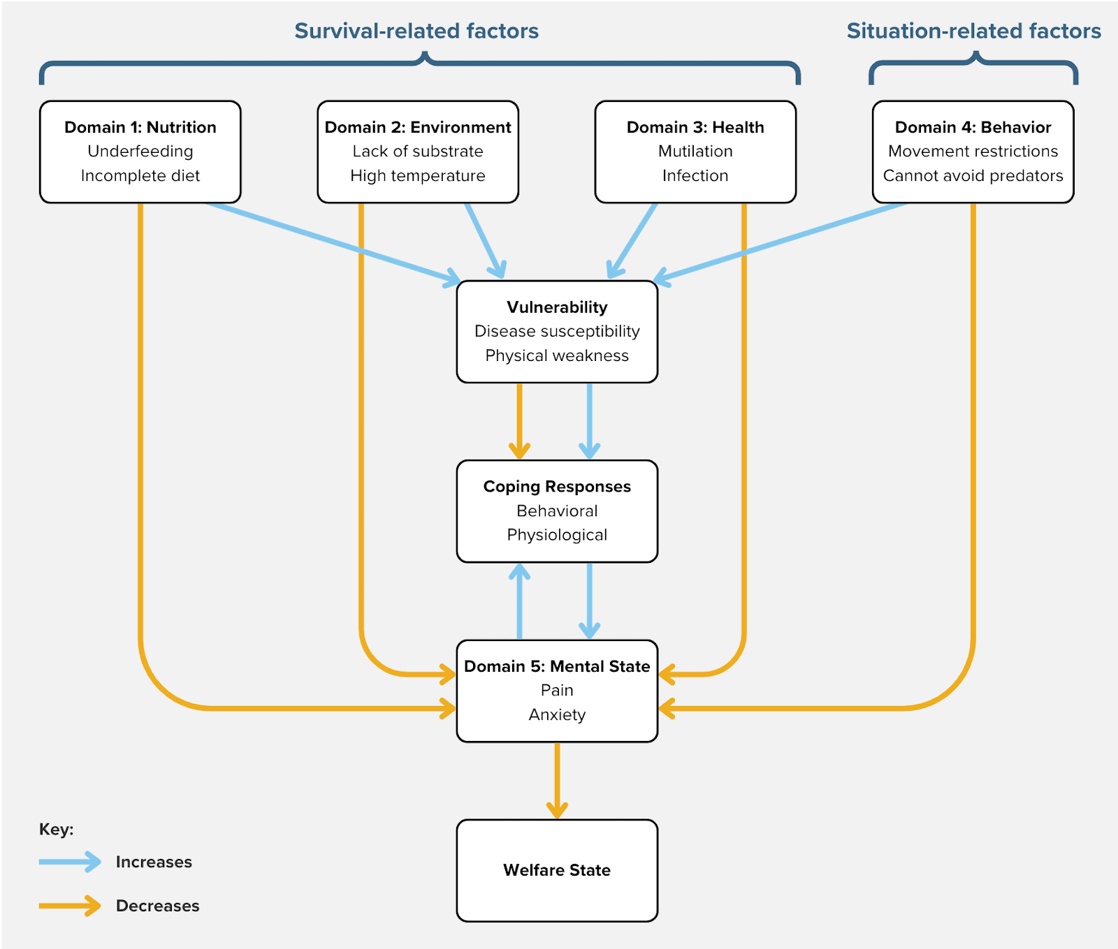 We embrace an affect-based definition of welfare that identifies an animal's welfare with the valence, duration, and intensity of its experiences. To identify proxies for valenced experience, we adopt the Five Domains framework (Mellor et al., 2020; see Figure 1), which was originally applied to terrestrial vertebrates but has recently been extended to aquatic invertebrates (Pedrazzani et al., 2023; Perkins, 2021). Domain 1 is Nutrition (e.g., restricted feed intake reduces welfare, a balanced diet increases it), Domain 2 is Environment (e.g., overcrowding reduces welfare, a clean space increases it), Domain 3 is Health (e.g., mutilations reduce welfare, high immune capacity increases it), and Domain 4 is Behavior (e.g., a barren environment reduces welfare, an absence of predators increases it). The first four domains do not themselves reflect good or bad welfare, but instead influence welfare via Domain 5, Mental State (e.g., pain is a manifestation of negative welfare, comfort is a positive welfare state; Mellor & Beausoleil, 2015, p. 242).