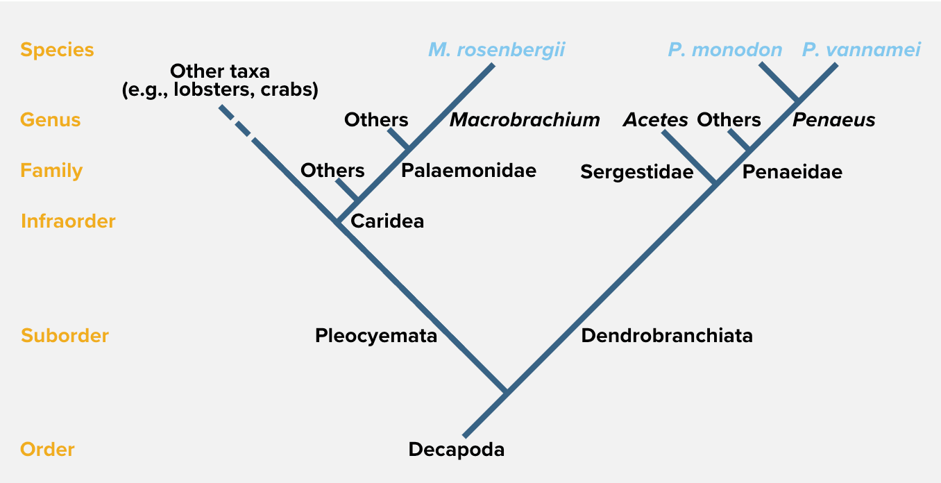 Figure 3: Partial phylogeny of decapod shrimp. Taxonomic rank is in yellow, and in blue are the taxa we focus on throughout the report. Based on Bauer (2004, p. 206) and Wolfe et al. (2019).