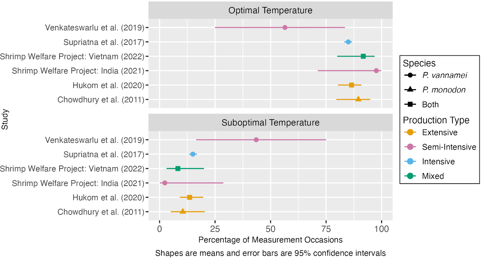 Our quantitative analysis of reports of water quality in shrimp ongrowing ponds suggests that temperature is within the optimal range around 80% of the time on average and suboptimal around 12% of the time. The outlier is Venkateswarlu et al. (2019), where temperatures were roughly split between optimal and sub-optimal, and were practically never unacceptable. Examination of this dataset suggests that low temperatures are probably a more common issue than high temperatures. This is surprising insofar as farmers avoid stocking shrimp during cold spells or the cold season (Lin & Drazba, 2006, p. 79). On the other hand, the datasets with an appreciable frequency of suboptimal temperatures more often show high temperatures.