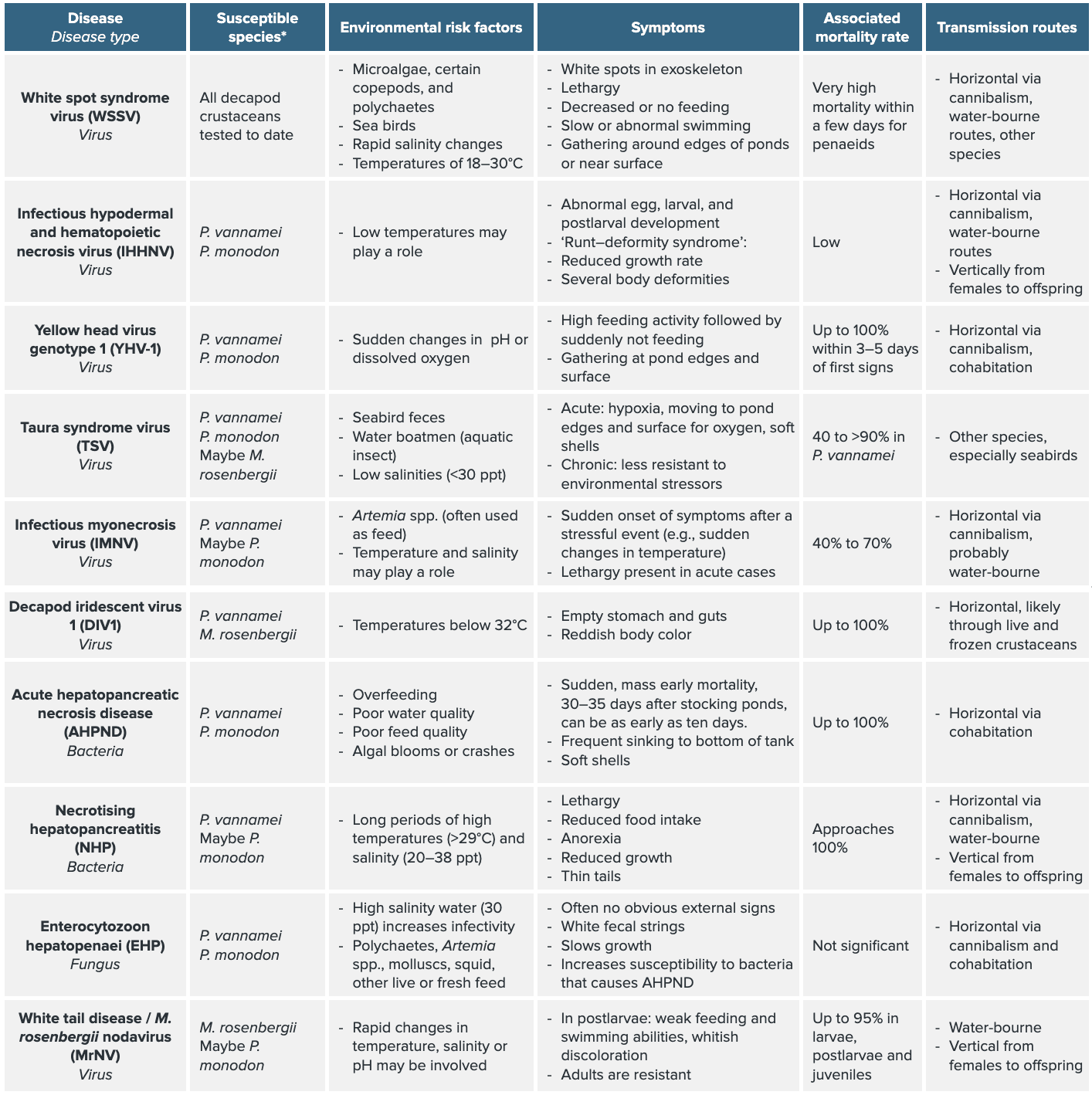 Table 2. Main diseases in farmed shrimp. Based on World Organisation for Animal Health Aquatic Animal Health Code Sections 2.2.1., 2.2.3., 2.2.4., 2.2.5., 2.2.6., 2.2.7., 2.2.8., 2.2.9., and disease cards for Enterocytozoon hepatopenaei and Decapod iridescent Virus 1.