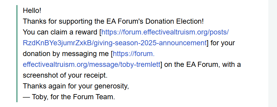 - You might believe that the Donation Election will choose more cost-effective projects than you would, or subvert biases which you wouldn't endorse on reflection. Although you can also donate to a fund if this is your main objective.