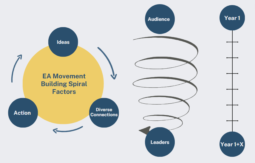 I thought having many different forms of engagement at each stage was implicit to the funnel model as well, but having it explicit as "action, ideas, and diverse connections" seems like a useful framework. I'll think more about what this could mean in practice for us in my group