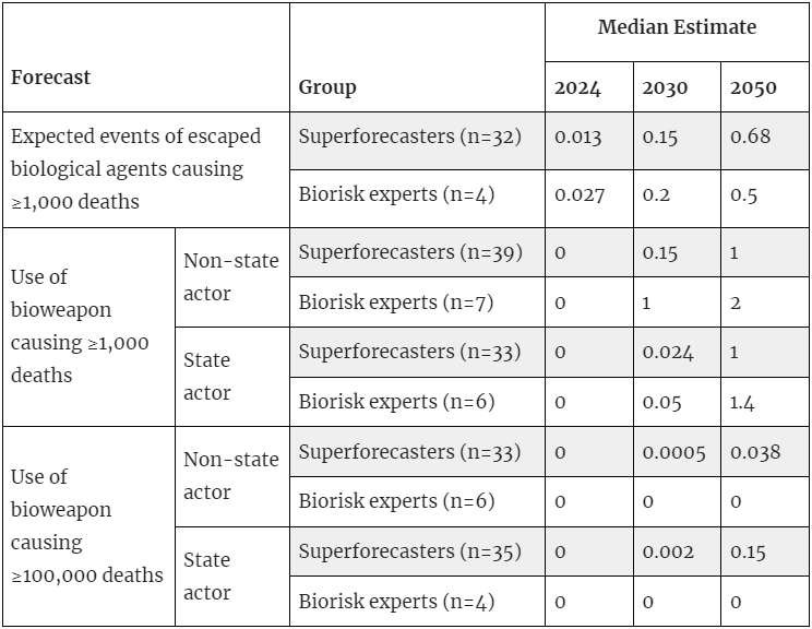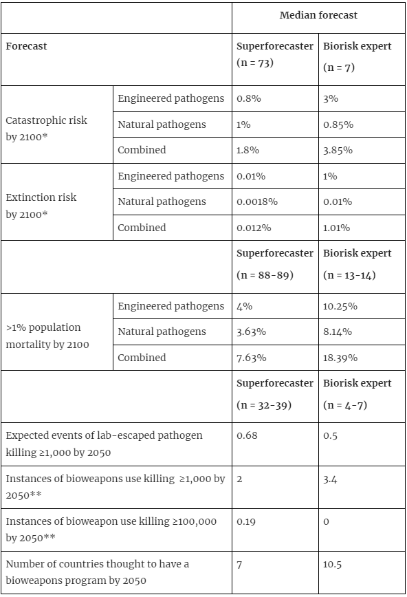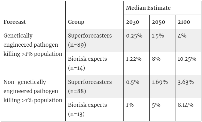 - When asked to predict the expected number of events[8] of a laboratory-escaped biological agent causing more than 1,000 deaths by 2050, the median biorisk expert prediction was 0.5 and the median superforecaster prediction was 0.68.[9]