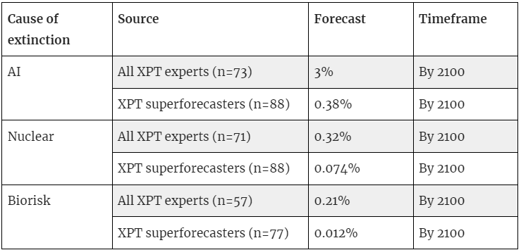 - Of the anthropogenic risks that were asked about in the XPT (AI, nuclear, and biorisk), biorisk was considered the least likely to cause a catastrophe or human extinction, by both superforecasters and experts.
