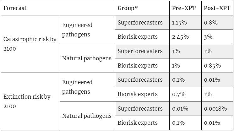 As noted earlier, questions on catastrophic and extinction risk from pathogens (genetically-engineered and non-genetically-engineered) were not included in the main component of the XPT. Participants were asked these questions before and after the XPT.[5]