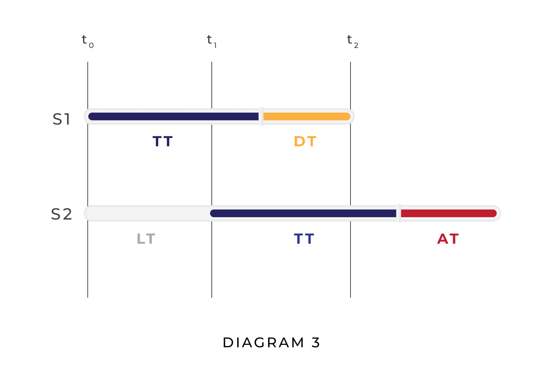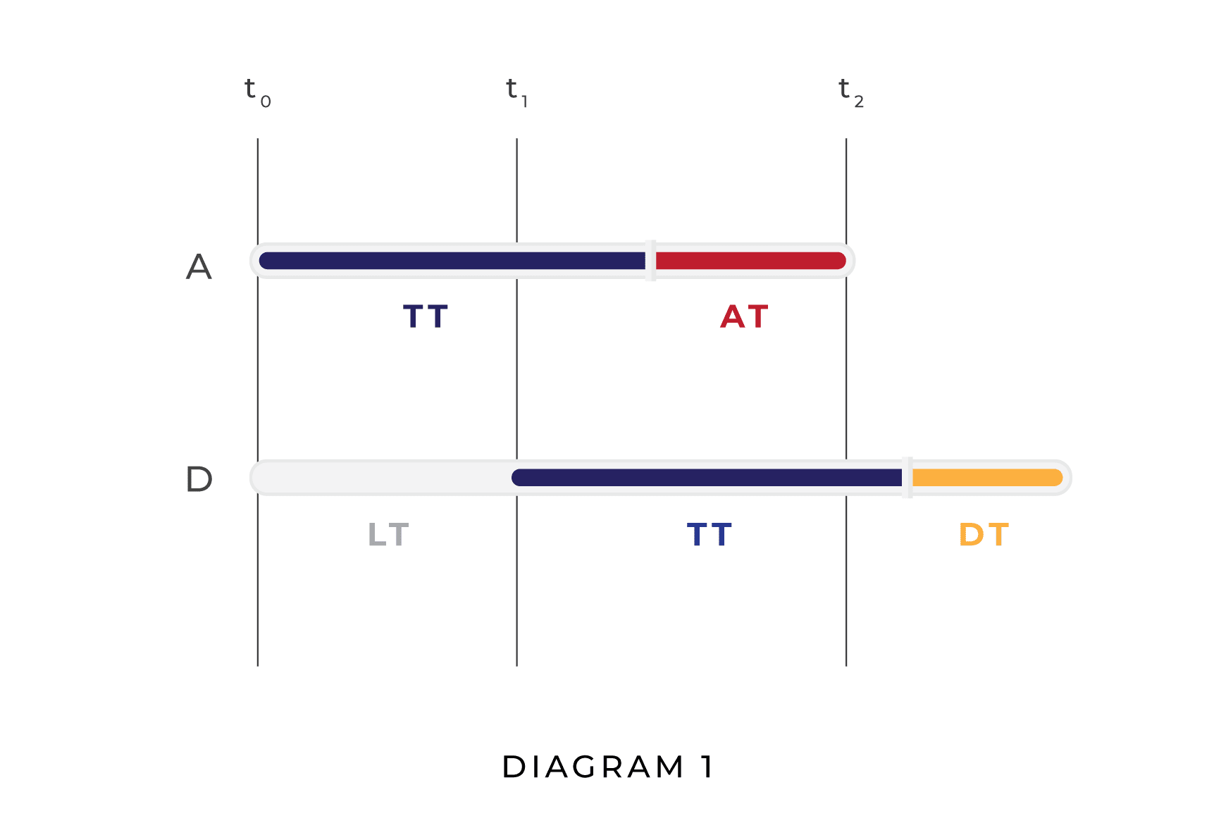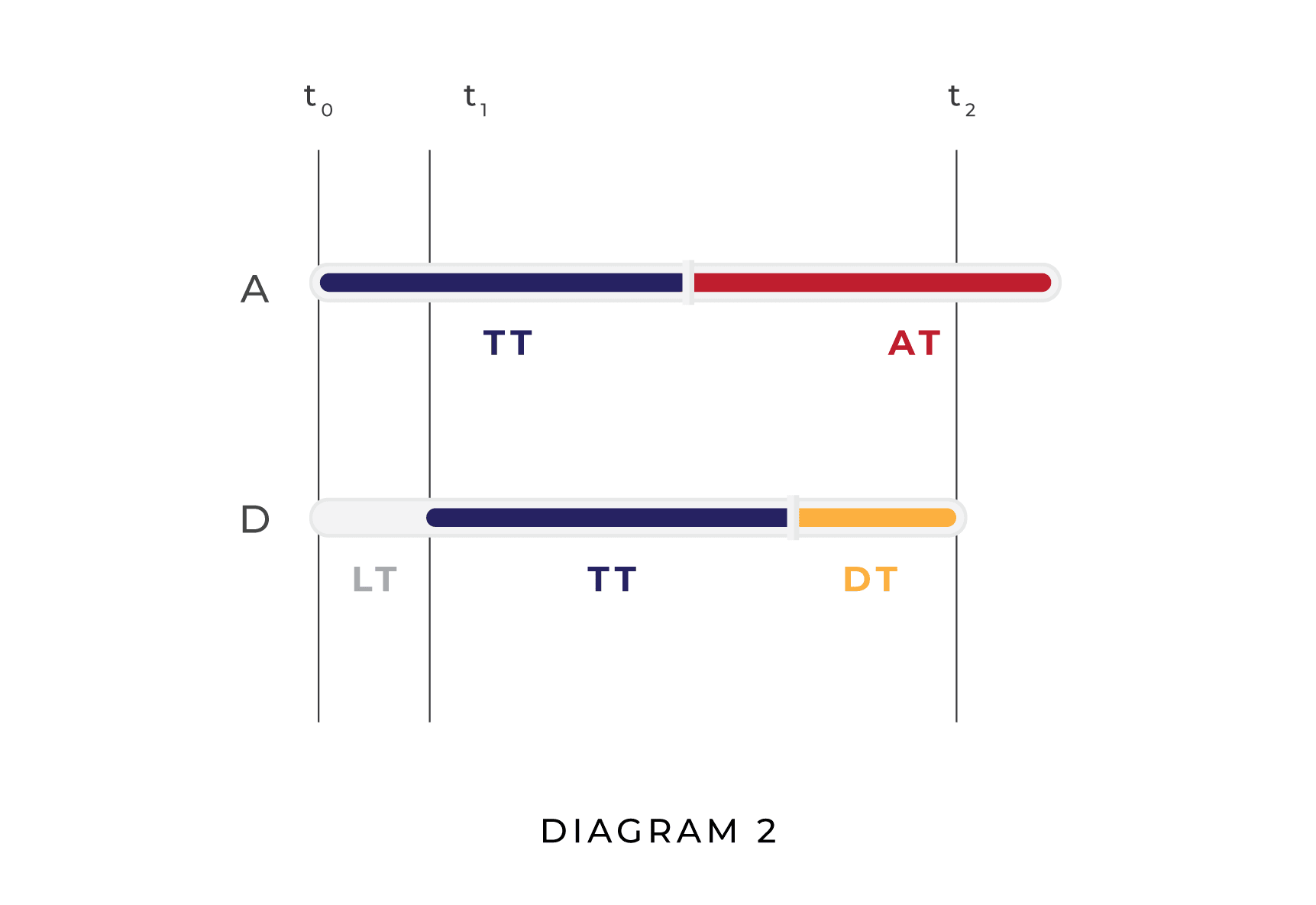 In Diagram 1, AT is greater than DT and LT is greater than AT, whereas in Diagram 2 AT is longer than LT, which is in turn longer than DT. Naturally, other relationships between AT, DT, and LT are possible; Diagram 1 and Diagram 2 do not represent the full range of possibilities. Their purpose is to show visually how, given our assumptions, whether a situation results in a unipolar scenario or a multipolar scenario is a function of LT, DT, and AT.
