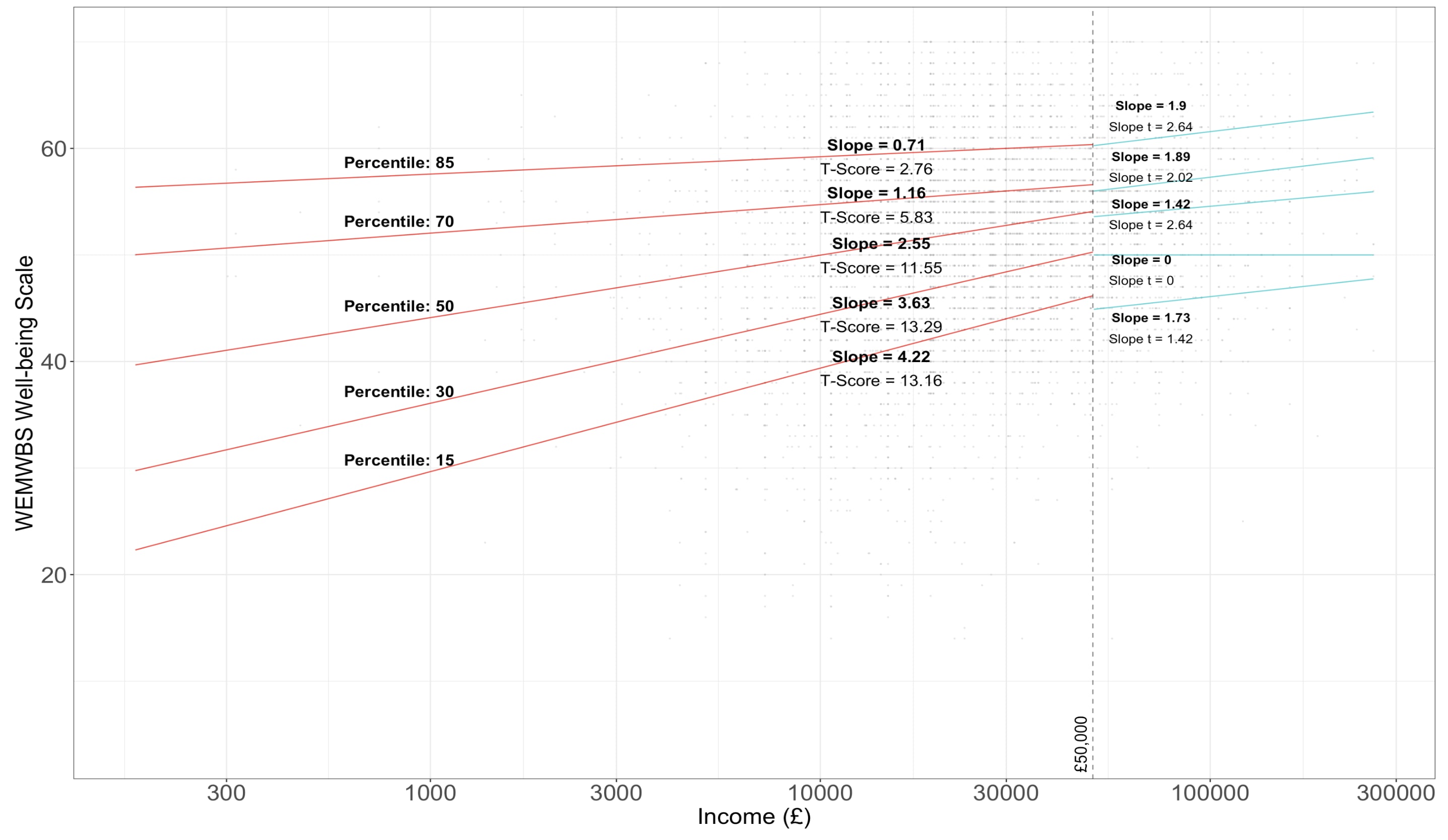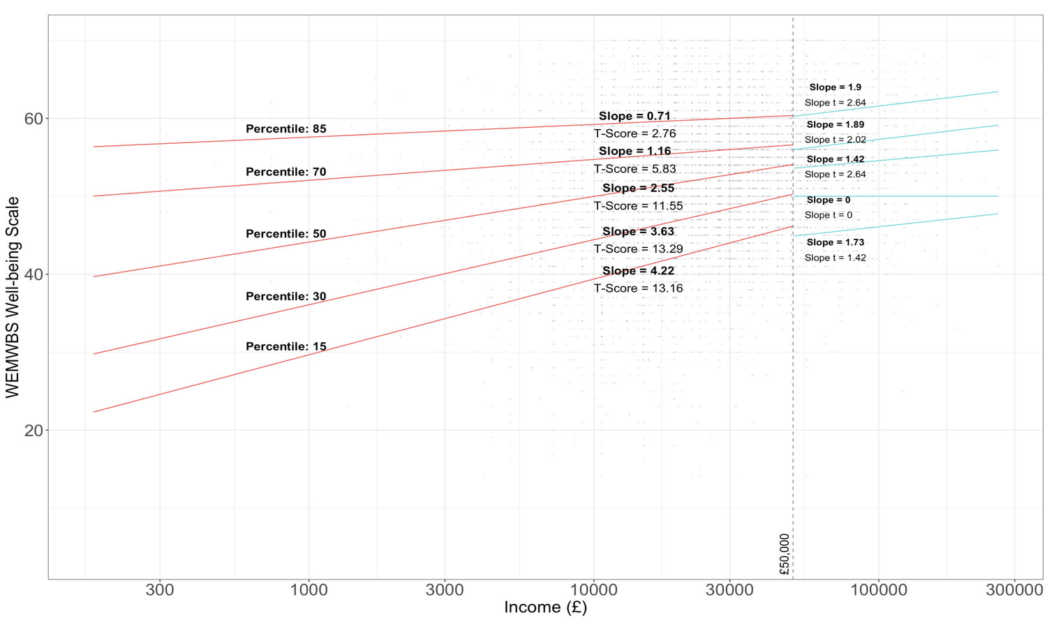 - For the median and majority of the population (50th, 70th, 85th percentiles), happiness continues to increase with log income above a high threshold (£50,000 in 2012).
