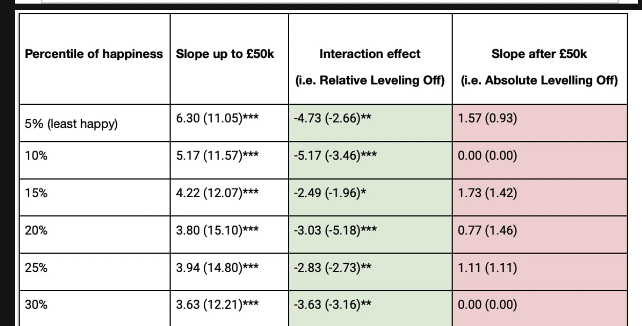 2) < Or, the 15 percentile slopes are far higher than the other slopes > Agreed, this is probably the most robust finding. I feel pretty uncomfortable about translating this into policy or prescriptions about cash transfers, because this stuff was all correlative; and unearned income might affect happiness differently from earned income.