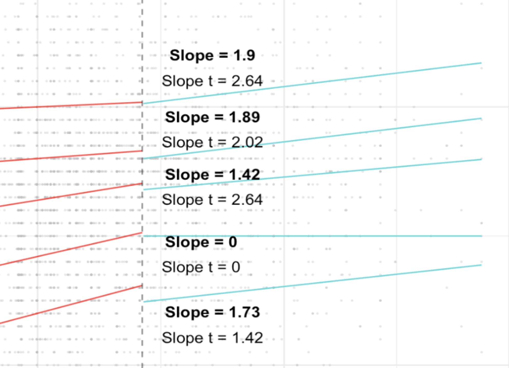 This data is the part I was nervous about. I don't see a great indication of "leveling off" in the blue lines. Many have a higher slope than the red lines, and the slope=0 item seems like an anomaly.