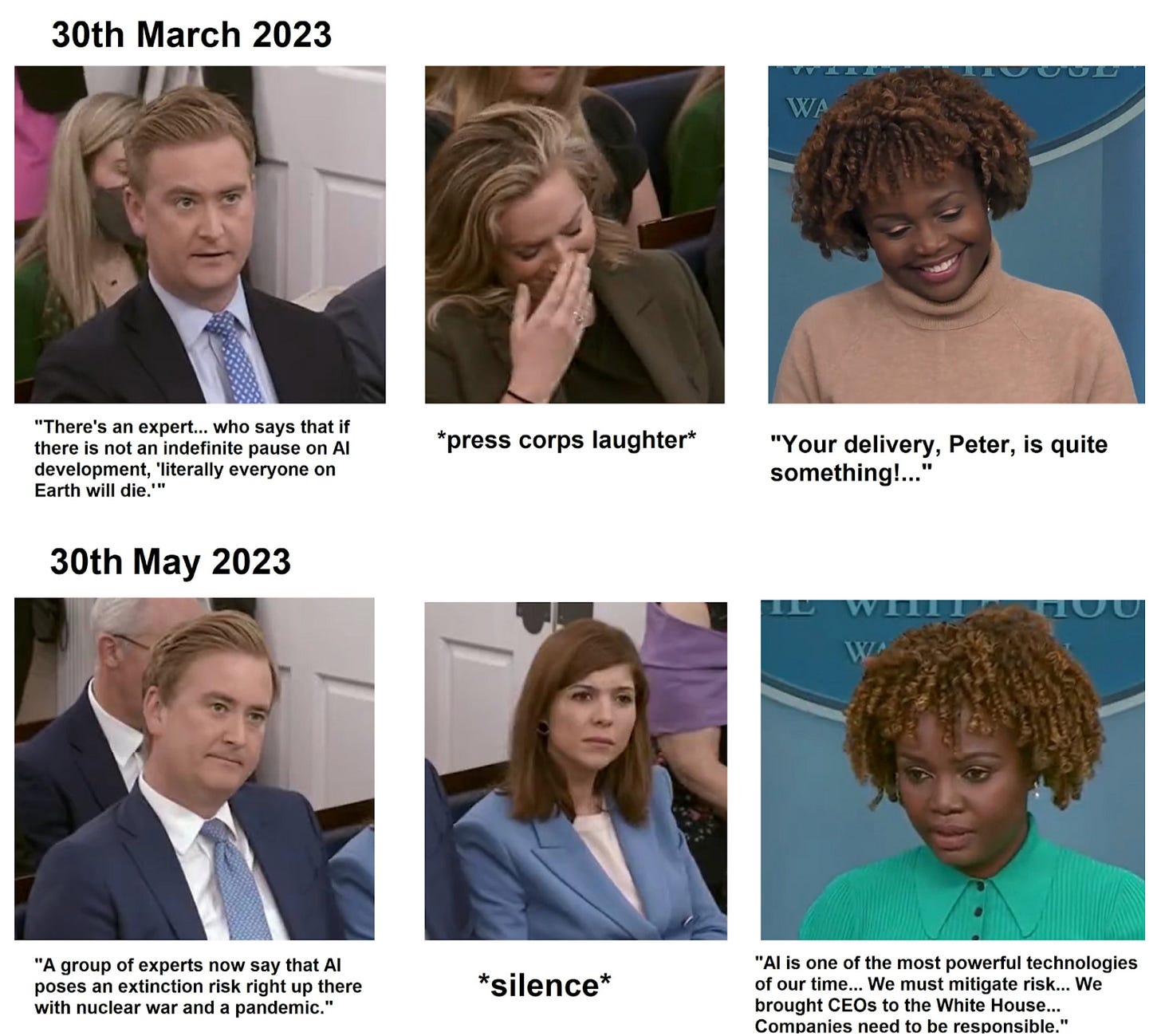 Only a few months ago, White House press secretary Karine Jean-Pierre laughed at the notion of extinction risks from AI. Now, the Biden administration is striking a different tune. Their new 2023 National AI R&D Strategic Plan explicitly calls for additional research on the “existential risk associated with the development of artificial general intelligence.”