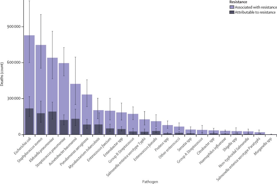 Figure 1: Global deaths (counts) attributable to and associated with bacterial antimicrobial resistance by pathogen, 2019(Source).
