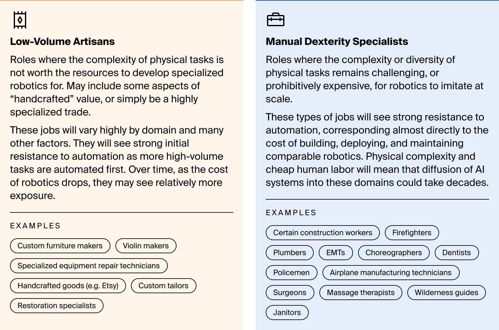 Competitive Advantage: Certain artisans currently have highly technical, niche physical skills that may not make financial sense to teach robots to emulate. They may have developed relationships and trust over time with consumers that may be resilient to automation, especially in niche domains. Most importantly, developing and deploying specialized robotics at scale will continue to be expensive even after TAI exists.