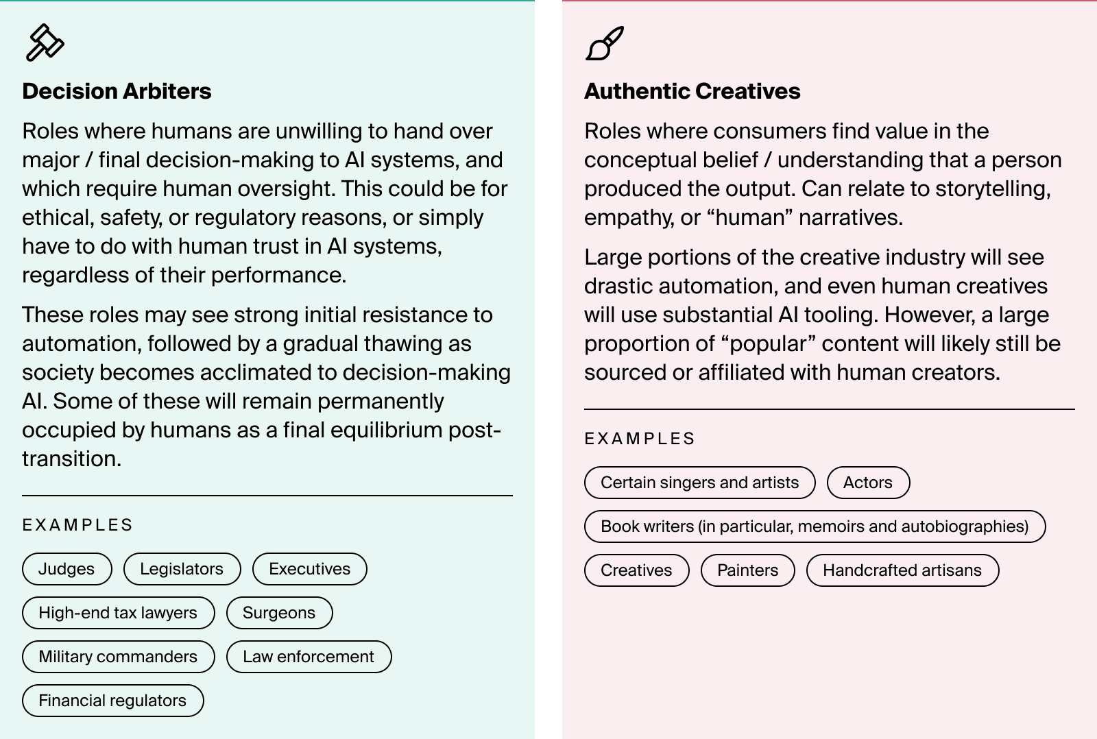 Many of these roles will see society decide that they should be permanently occupied by humans. We will not permit full automation by AI systems for some of these roles, either from a legal standpoint or via societal pressure.