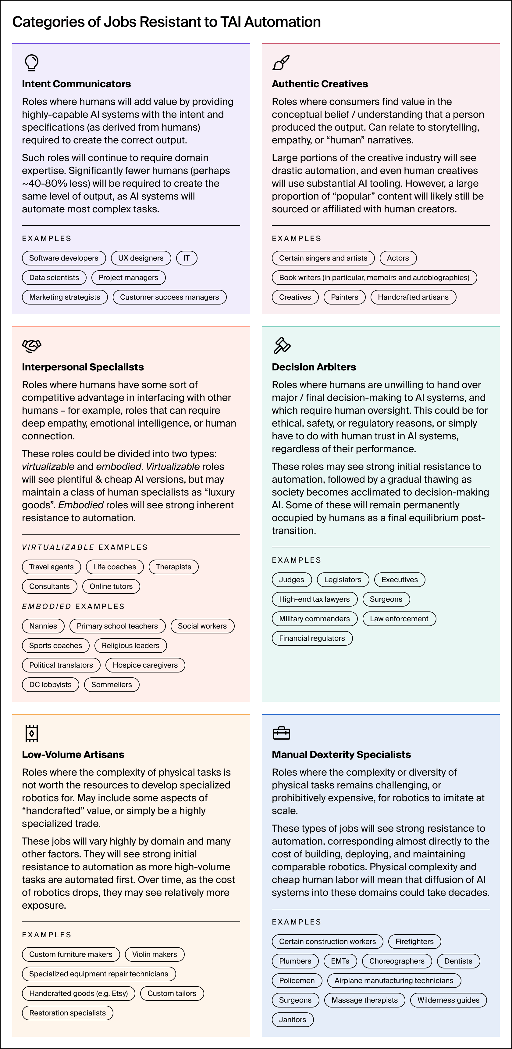 On the other hand, many economists and much of the political ecosystem is operating under the assumption that AI will be primarily augmentative, not automative, and that we do not need to be overly concerned about massive labor displacement. We also believe this is a deeply limited worldview and fails to consider the possibility of TAI existing and having broadly automative capabilities. Assuming that TAI will exist and can automate most cognitive and manual labor, we will illustrate how we expect even the most “TAI-resistant” jobs described to be massively impacted.