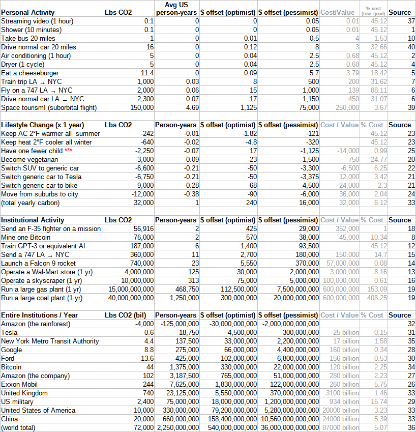 For example in Canada, which has some of the highest yearly carbon emissions per capita in the world at around 19 tons of CO2 or 5 tons of carbon per person, roughly 5 millilives are sacrificed by an average person each year. As the average Canadian lives to be about 80, he/she sacrifices about 400 millilives (0.4 human lives) in the course of his/her lifetime, in exchange for a carbon-intensive lifestyle