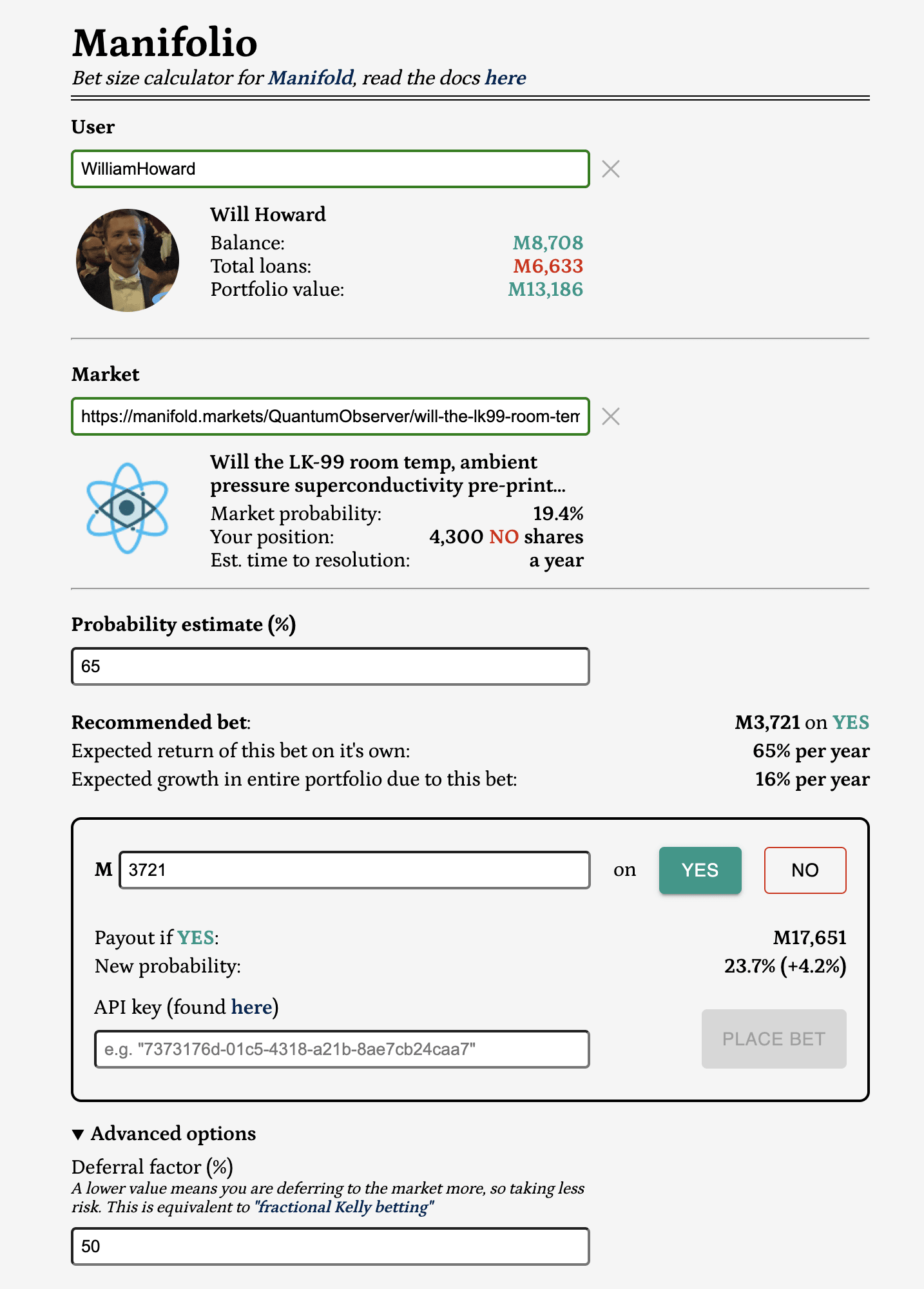 I've made a calculator that makes it easy to make correctly sized bets on Manifold. You just put in the market and your estimate of the true probability, and it tells you the right amount to bet according to the Kelly criterion.