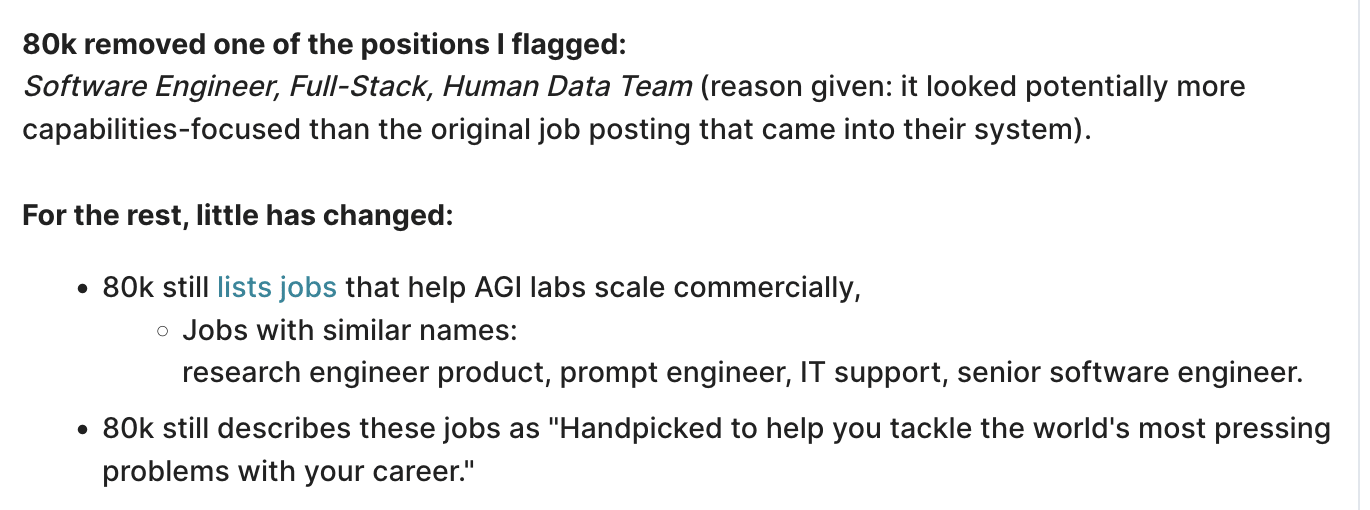 Five months ago, I posted my concerns publicly. Again, 80k staff removed one job listing (why did they not double-check before?). Again, staff referred to their website articles as justification to keep promoting OpenAI and Anthropic safety and non-safety roles on their job board. Again, I pointed out what's missing or off about their justifications in those articles, with no response from staff.